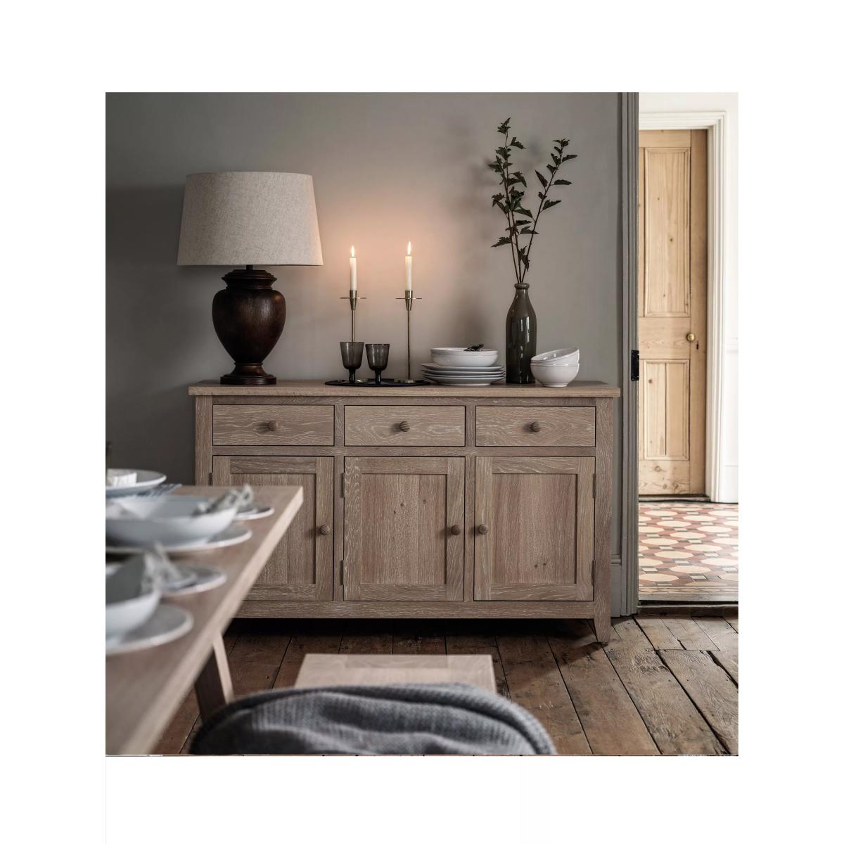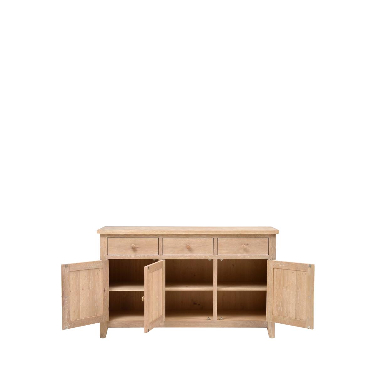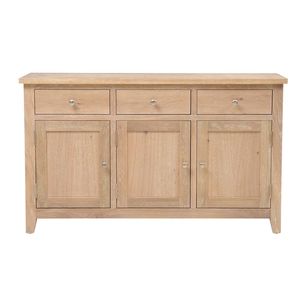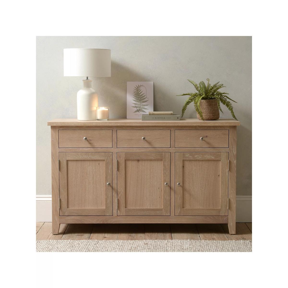 This beautiful whitewash three door sideboard is the perfect addition to any dining room or kitchen. The solid oak frames and real oak veneers give it a classic look that will never go out of style. Want to see it first? You may want to see and get a feel for the furniture in one of our shops before ordering. We'll be able to tell you where the range you'd like to view is on display.