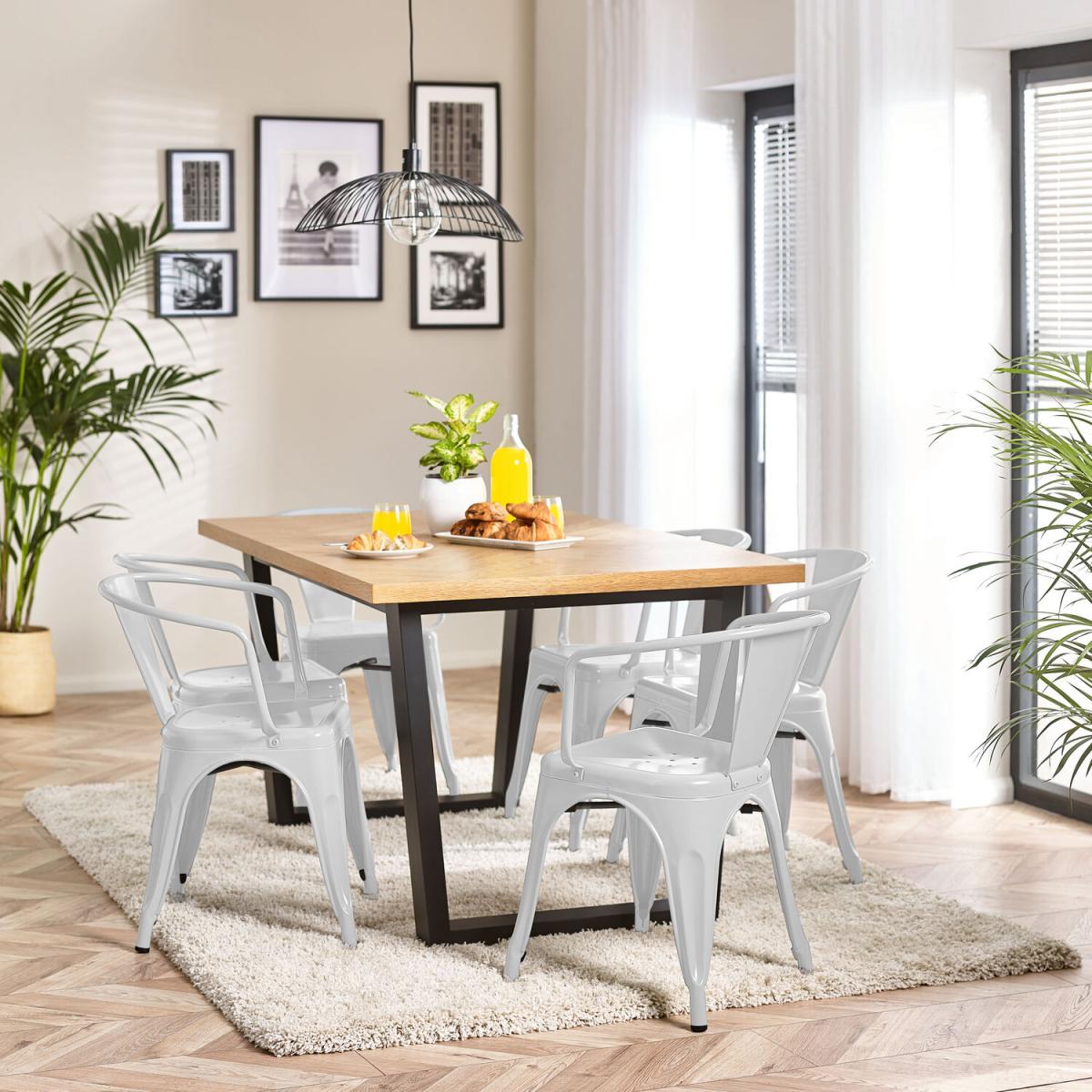 Our Cotswold solid wood 4 seat dining table is something a little bit special. It's a modern take on more traditional wood dining furniture, with wooden Industrial style black U shaped legs and a wood table top that features a stunning real-oak herringbone veneer overlay. It's mix of contrasting colours means it will look fab in a range of home styles, from minimalist to maximalist, boho to Industrial-Scandi, modern to more rustic farmhouse cottage looks. We love a versatile piece and know the Cotswold is going to be the heart of your home! Comfortably seats 4, so great for smaller spaces. Both the legs and table top are wood. The legs are solid and painted black. The top is high-quality wood composite covered with that lovely 100 real oak herringbone veneer. This table is built to last and look great while doing it! Our Colton white metal dining chairs with arms are stackable, stylish and made of steel. We love versatile dining room furniture and these are just the ticket. Our take on the classic Tolix mid century chairs design created for commercial seating at restaurants, these chairs are designed to be comfy to sit on for longer periods, are lightweight, durable and easy to move around. They perfectly capture that laid back bistro cafe vibe and will look fab in your Industrial style kitchen or dining area. The simple solid white colour will also suit more sleek minimalist modern home styles, or add some contrast to a bold scheme. Constructed from hard-wearing steel, powder coated in semi-glossy white finish, with non-slip pads to the feet.