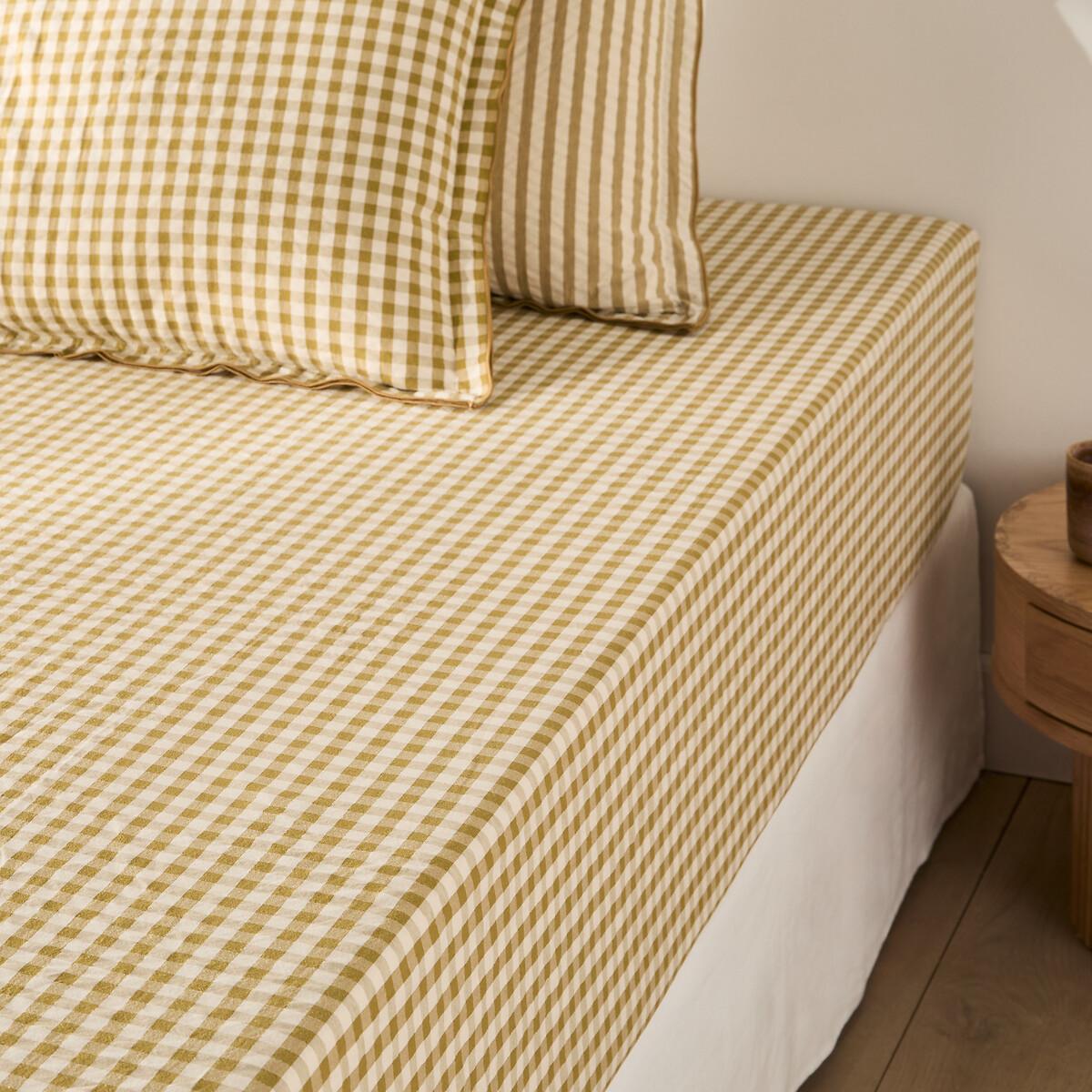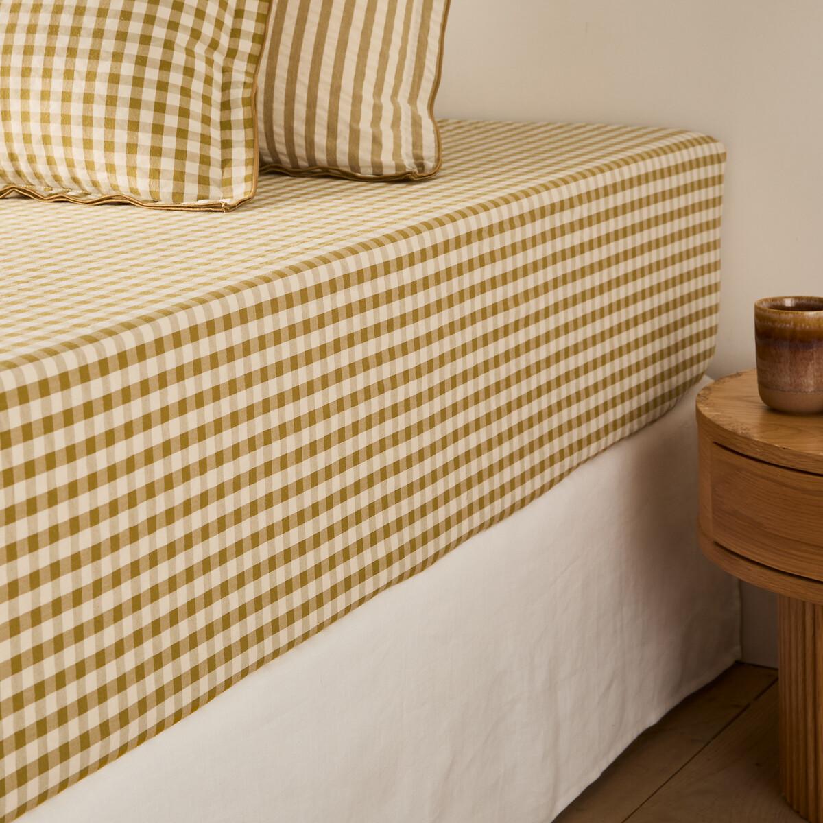 The Cottage fitted sheet is one of the Signatures of La Redoute Intérieurs. A selection of exclusive creations, designed by our in-house design studio. Inspiring, easy to live with, trendy... these products have become our customers' favourites. and no doubt yours!.In lightly embossed washed cotton using the seersucker technique, the Cottage bed linen set plays on the contrasts between gingham checks and fine stripes. It evokes a timeless art of living, a blend of authentic charm and understated elegance. An internal design by Isabelle Olejniczak : “By creating Cottage, I wanted to evoke the warm and rustic world of the English countryside. The embossed appearance of seersucker, gingham on one side and striped on the other, gives it an arstisanal spirit. It is highlighted with a tone-on-tone feature on the double ruffle. "The washed cotton has been delicately bleached during its manufacture. Soft, supple and comfortable, it softens over time. Its slightly wrinkled appearance is incredibly on-trend, and it does not require ironing. Product Details • 100% cotton • 144 thread count • Seersucker dyed woven washed cotton • Gingham checks • Absinthe colour • Available in other colours • Flap height 30cm for thick mattresses. As the seasons go by, add your own personal touch by mixing the Cottage absinthe range with our Scenario range of plains. Care Advice • Machine washable at 60°C • By washing your laundry at 40°C instead of 60°C, you limit energy consumption. Dimensions • 90 x 190cm: Single • 140 x 190cm: King • 160 x 200cm: King • 180 x 200cm: King • OEKO-TEX® Standard 100. Standard 100 certification by OEKO-TEX® tests textile products for harmful substances via an independent, international label.
