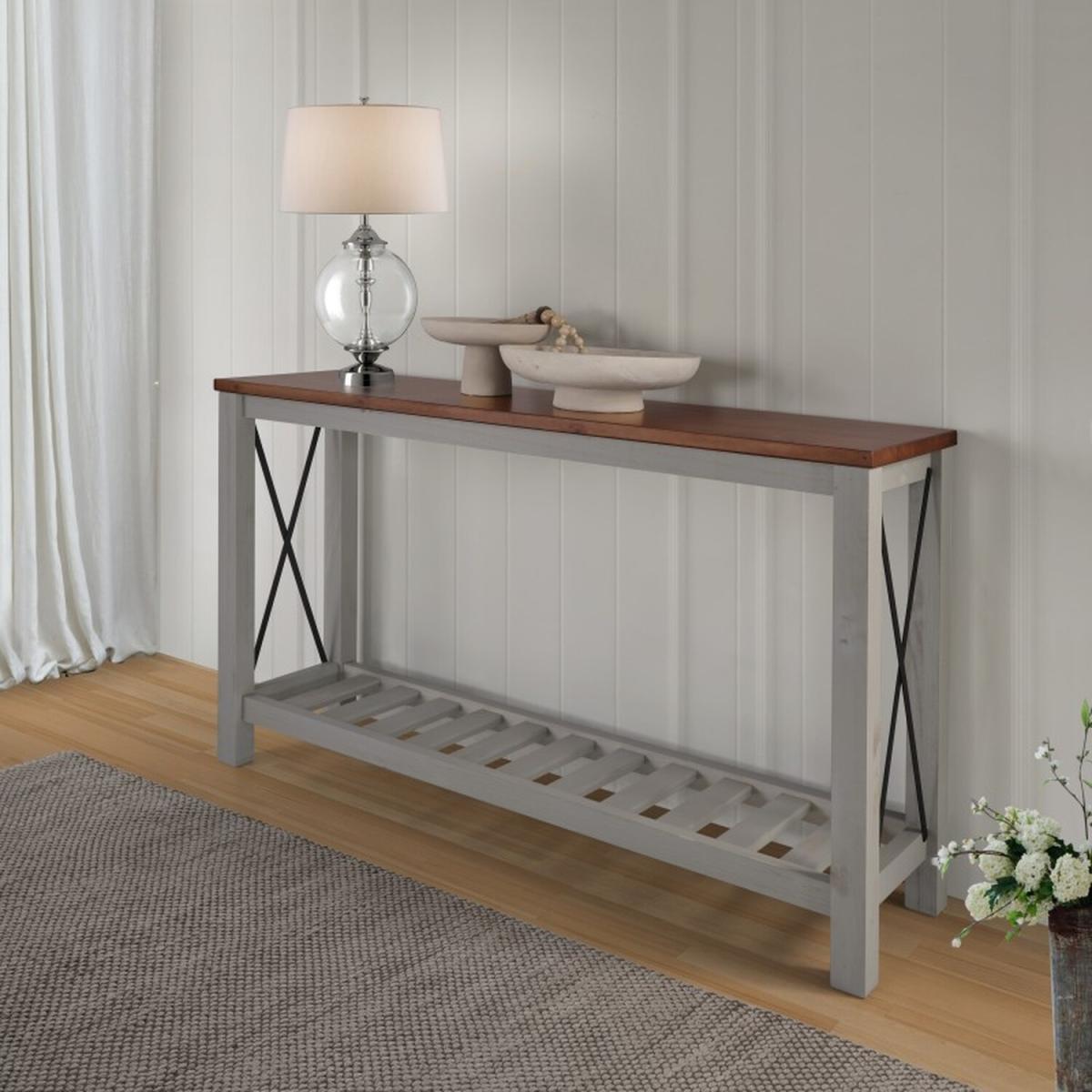 Elevate your home dcor with the timeless charm of the Cottage Black Sideboard. Expertly crafted from solid pine wood, this piece combines natural durability with a refined rustic aesthetic. The warm, walnut-toned top contrasts beautifully with the matte black finish of the frame, creating a classic two-tone look that fits seamlessly into cottage, farmhouse, or transitional interiors. The sideboard features a sturdy slatted lower shelf perfect for storing baskets, plants, or dcor, while decorative X-frame accents on the sides add a touch of cottage character. Whether placed in an entryway, dining area, or living room, this sideboard offers both style and function. Supplied flat packed for easy home assembly. Height - 81cm Width - 132cm Depth - 36cm Elevate your home dcor with the timeless charm of the Cottage Grey Sideboard. Expertly crafted from solid pine wood, this piece combines natural durability with a refined rustic aesthetic. The warm, walnut-toned top contrasts beautifully with the matte grey finish of the frame, creating a classic two-tone look that fits seamlessly into cottage, farmhouse, or transitional interiors. The sideboard features a sturdy slatted lower shelf perfect for storing baskets, plants, or dcor, while decorative X-frame accents on the sides add a touch of cottage character. Whether placed in an entryway, dining area, or living room, this sideboard offers both style and function. Supplied flat packed for easy home assembly. Height - 81cm Width - 132cm Depth - 36cm