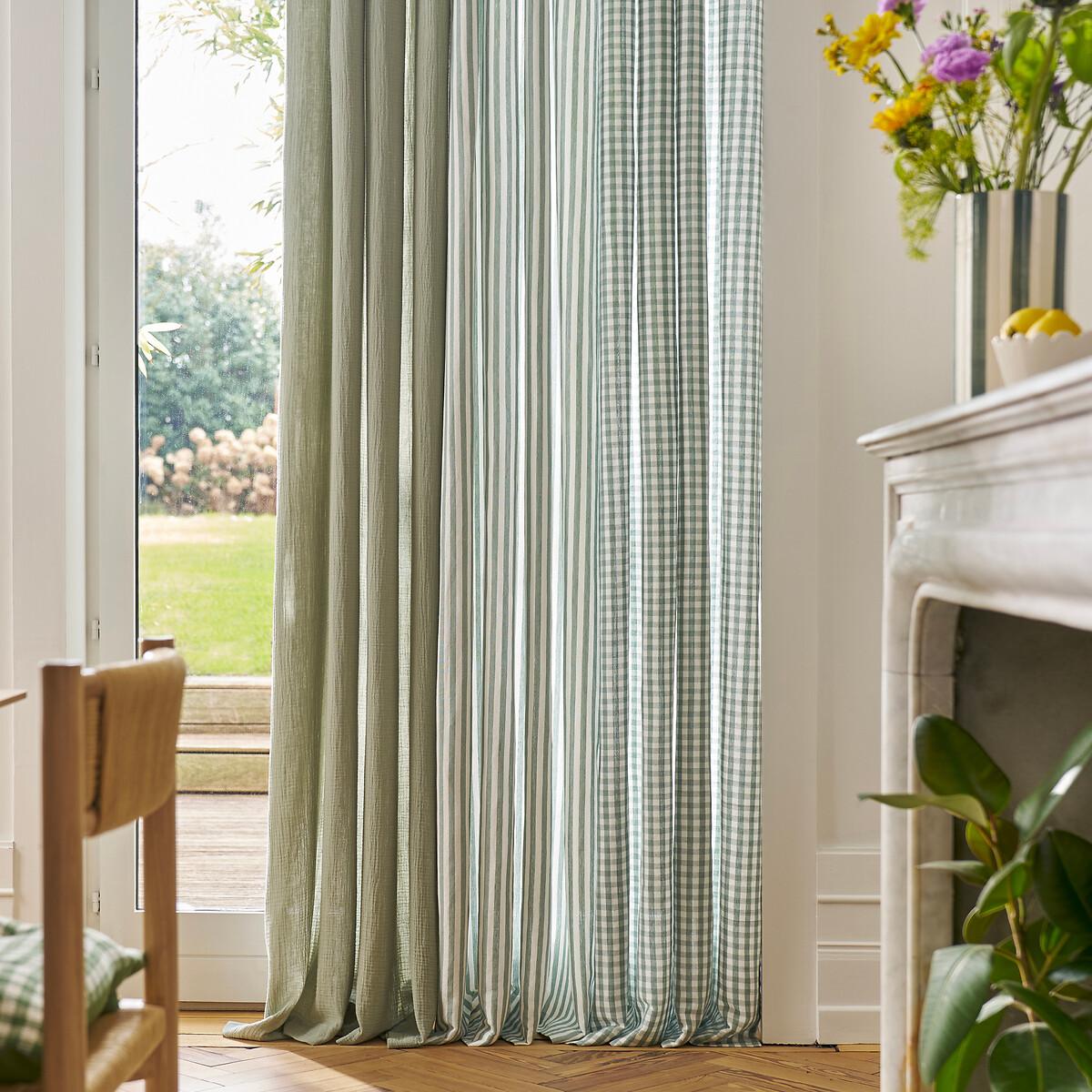 Cotton/linen check set. The Cottage Curtain evokes a timeless art of living in a world of elegance. Designed by La Redoute Intérieurs. Always on trend, it's easy to see why Signatures are often customer favourites. Will they be yours. An internal design by Isabelle Olejniczak : “By creating Cottage, I wanted to evoke the warm and rustic world of the English countryside. "Cotton & linen fabric combines the softness of cotton and the raw appearance of linen. Its crumpled appearance does not require ironing. The eyelets guarantee nice regular waves and ensure the fabric falls beautifully. They slide perfectly on the rod, making it easy to open and close the curtain. Product Details • Screening • 54% cotton, 46% linen, 130 g/m2 • Check print on both sides • Top finish : eyelets • Internal diameter of eyelets : 4cm/1.5" • Finished bottom : Plain hemmed edging. To help you in the choice and maintenance of your curtains, do not hesitate to consult our guide by typing "Curtain Buying Guide" in our search engine on the site. Care instructions • Machine washable at 30°C • Maximum shrinkage after washing : About 5% of the total. Fabrics made from natural fibres may shrink in the first wash. Always wash your curtains before making any alterations. • Do not tumble dry • If you don't need to iron them (linen curtains, Voile Panel...), let the curtains air dry by hanging them immediately after washing, making sure to spread them out to their full width. • If you want to iron your curtains, we recommend using a low-temperature steam iron or a steamer. Dimensions • Drop 180 x Width 140cm • Drop 250 x Width 140cm • Drop 300 x Width 140cm • Drop 350 x Width 140cm • OEKO-TEX® Standard 100. Standard 100 certification by OEKO-TEX® tests textile products for harmful substances via an independent, international label.