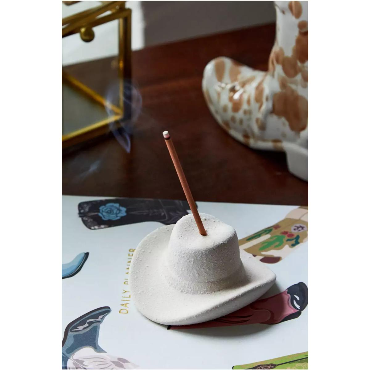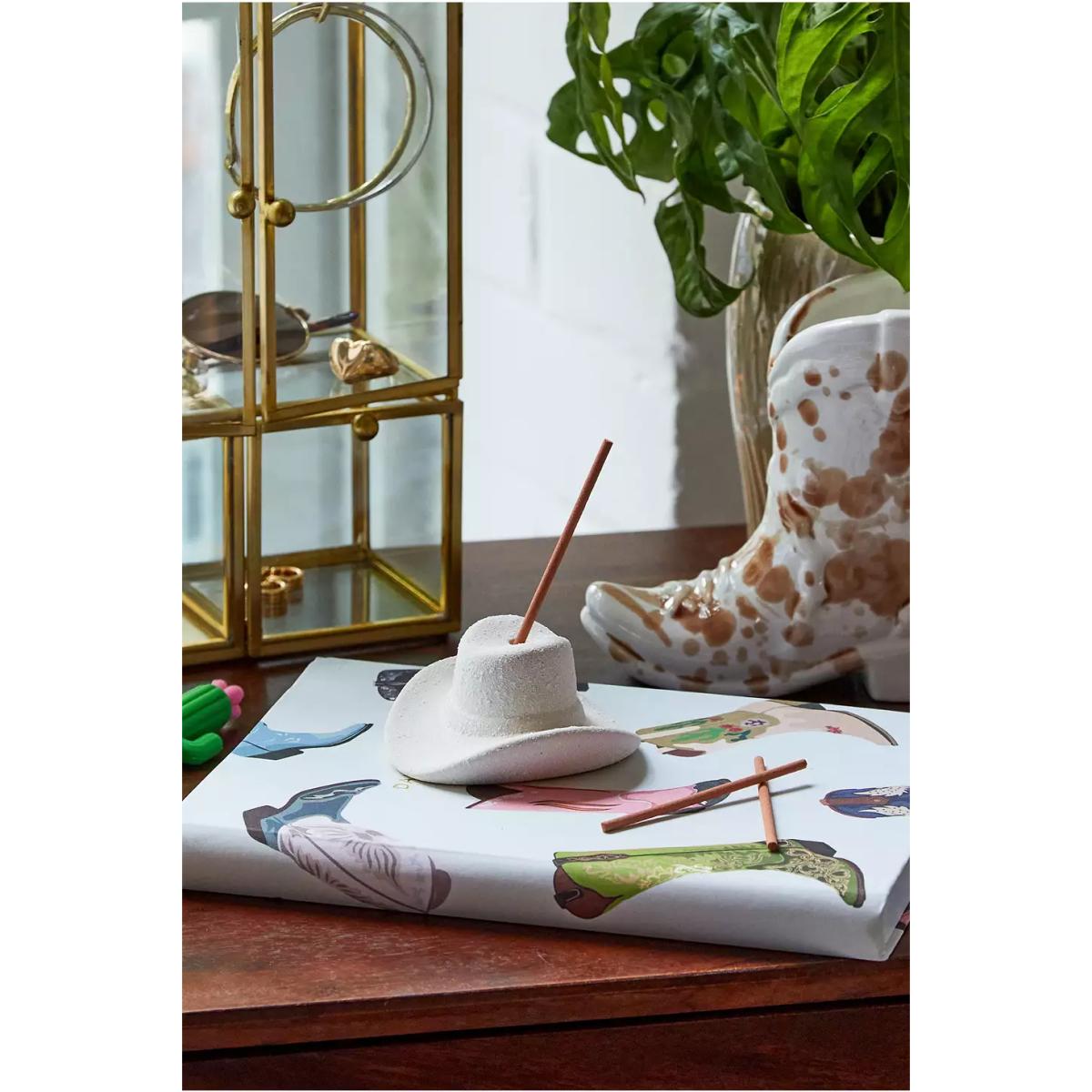 Bring Western vibes and calming scents into your space with this cowboy hat incense set. The ceramic hat is complete with a hole to the centre to rest your incense in. Complete with 100 fragrant incense sticks of cotton and teak, with notes of lemon zest, bergamot, sandalwood, teakwood and eucalyptus. **Content + Care** \- Includes 100 incense sticks \- Ceramic \- Wipe clean