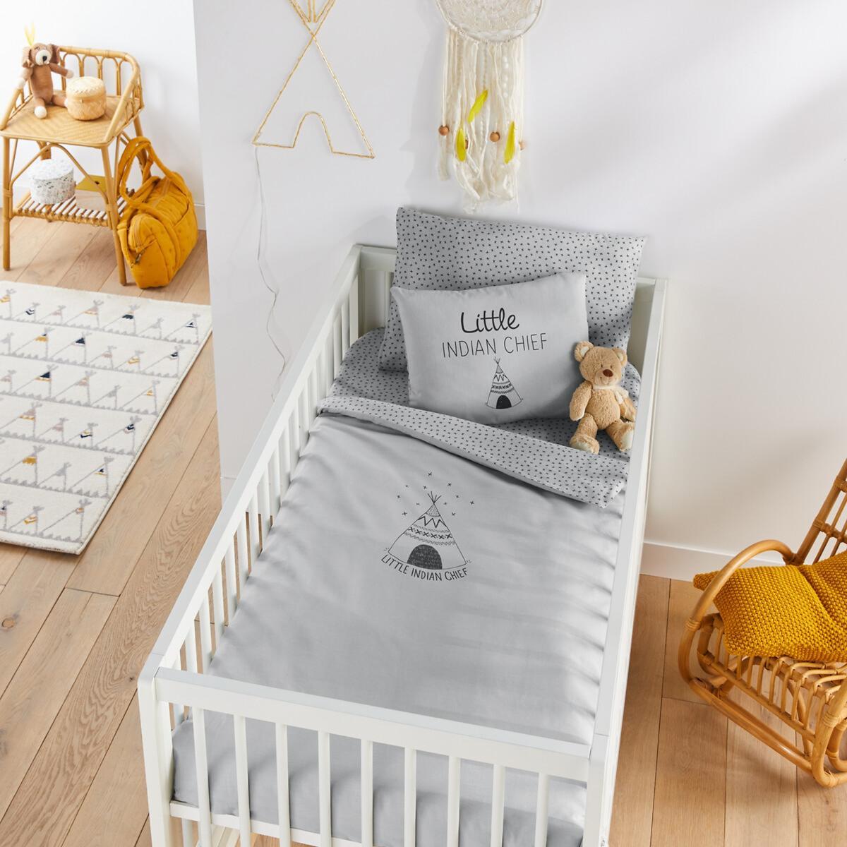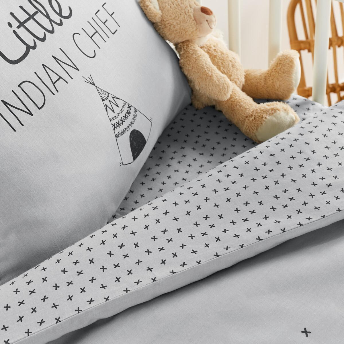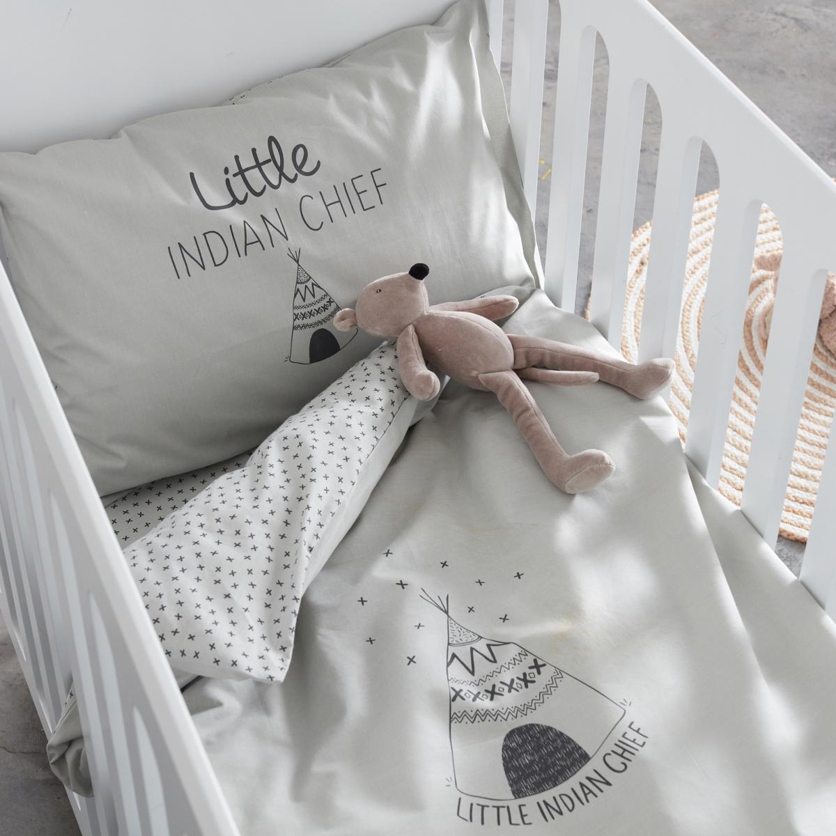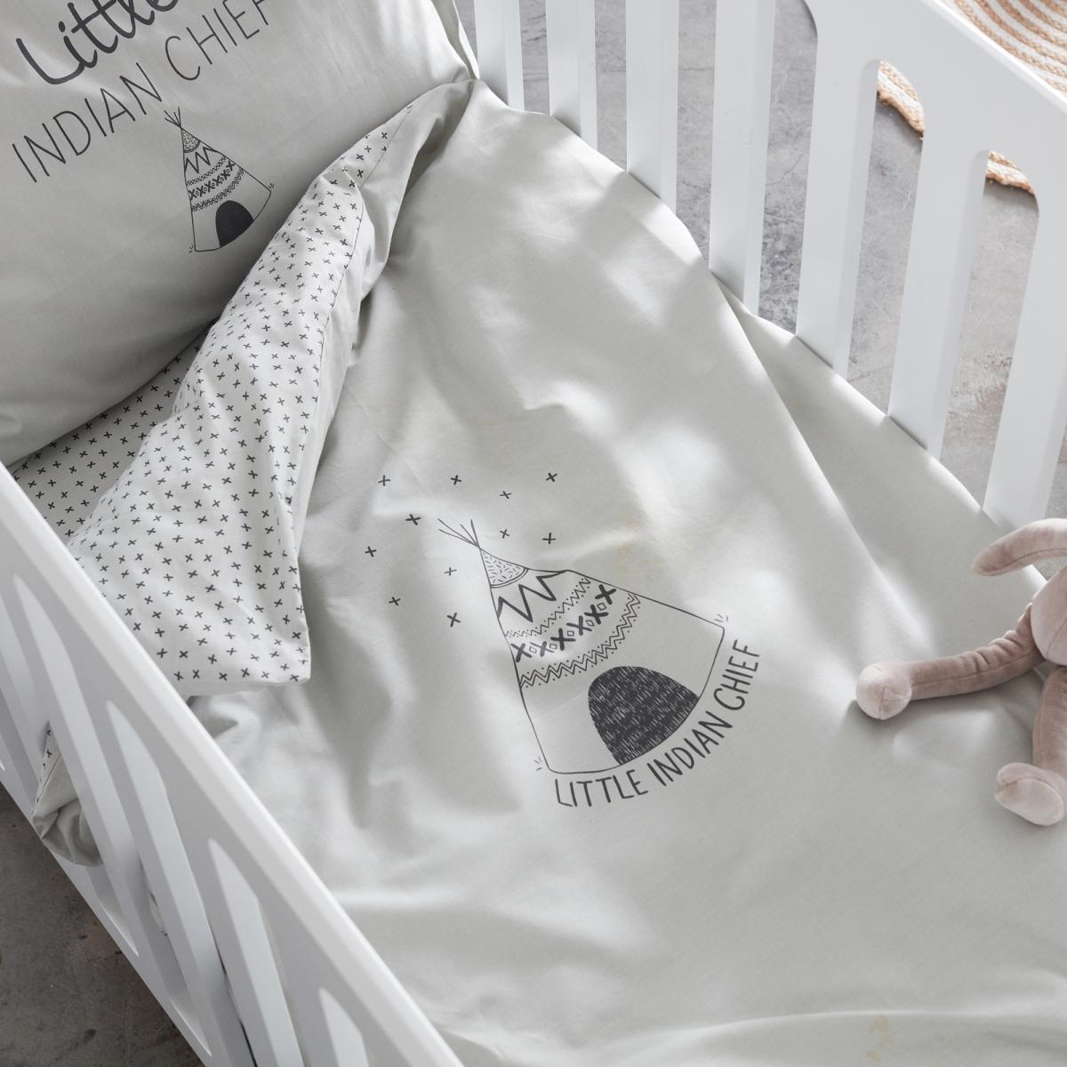 The baby duvet cover printed in TIPI cotton. A gorgeous block print on the front and a cute motif on the back combine to bring a cosy feel to baby's bed.
