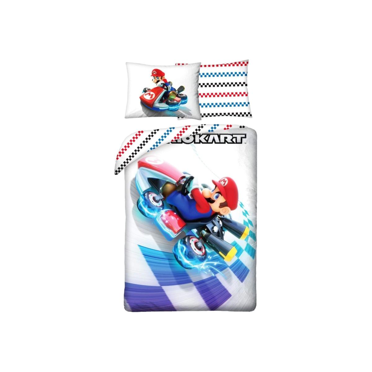 This Nintendo Mario Kart single duvet cover set is ideal for gamers of all ages. The fun design features Mario in his racing kart on a blue and white checked track, while the reverse has a repeat pattern of chequered stripes in blue, red and black on a white background. This bedding set is made from 100 cotton and can be machine washed and tumble dried on a low setting.