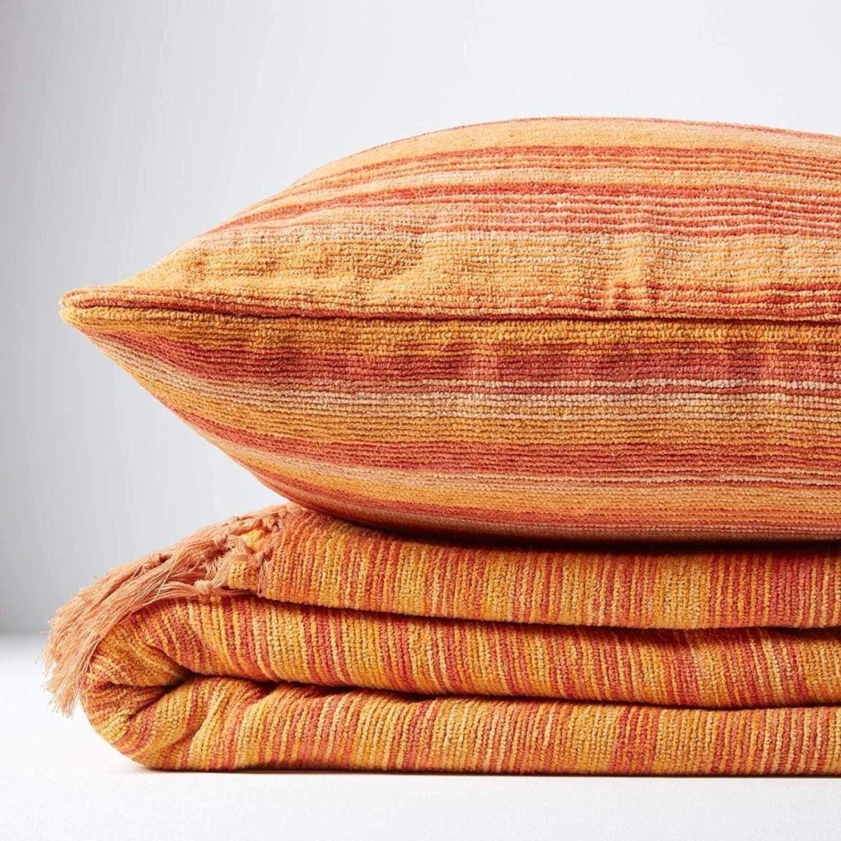 This Homescapes Cotton Chenille range of throws and cushions cover are designed to provide a quick and extremely affordable makeover of any room. Made up of Cotton these throws are hand woven on traditional handlooms in India using hand spun yarns. All the colours have been chosen very carefully keeping in mind the current hot trends and the evergreen classic. The graduating shades and the tie dye effect lend a unique charm to the product. The chenille yarn keeps the throws soft and adds to the warmth of the fabric. These throws can be put to multiple uses and yet is economically priced. Available in Beige, Rust, Green and Orange colours.