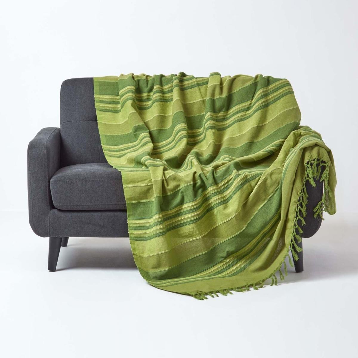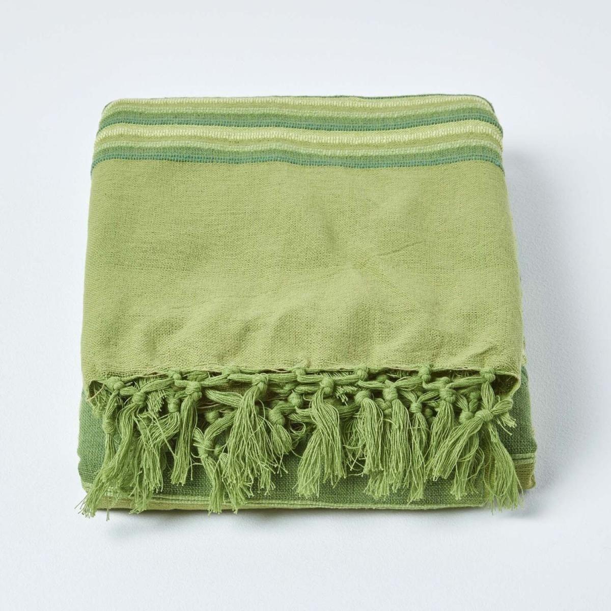 Colourful striped bedspreads and sofa throws from Homescapes transform your sofa or bed into a true eye-catcher. Would you like to add a splash of colour to your interiors Then Homescapes has just the right thing for you! All throws from the product range "Morocco" are manufactured by hand on traditional looms in India. Thus, each blanket is unique! The proceeds from the sales go directly to the weavers and their families, enabling a significant improvement of their living conditions. To complement the bedspreads and throw, Homescapes also offers eyelet curtain pairs, cushion covers and floor cushions in 9 beautiful colours (blue, beige, terracotta, yellow, green, pink, purple, grey and black and white (monochrome)). So, you can decorate your bedroom or living room according to your preference and liking.