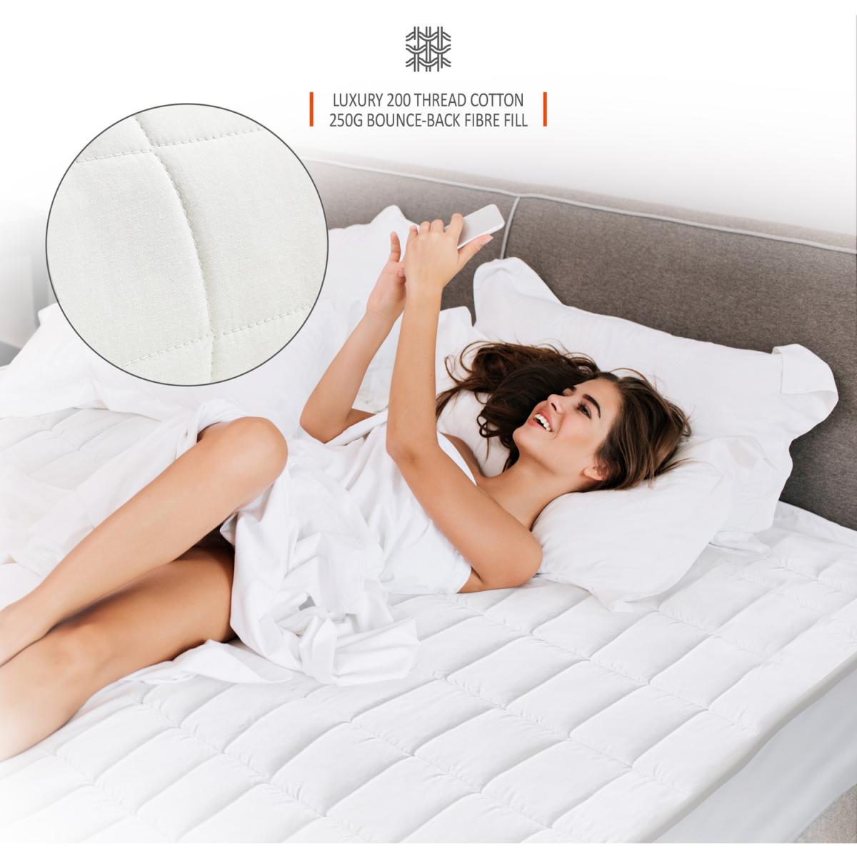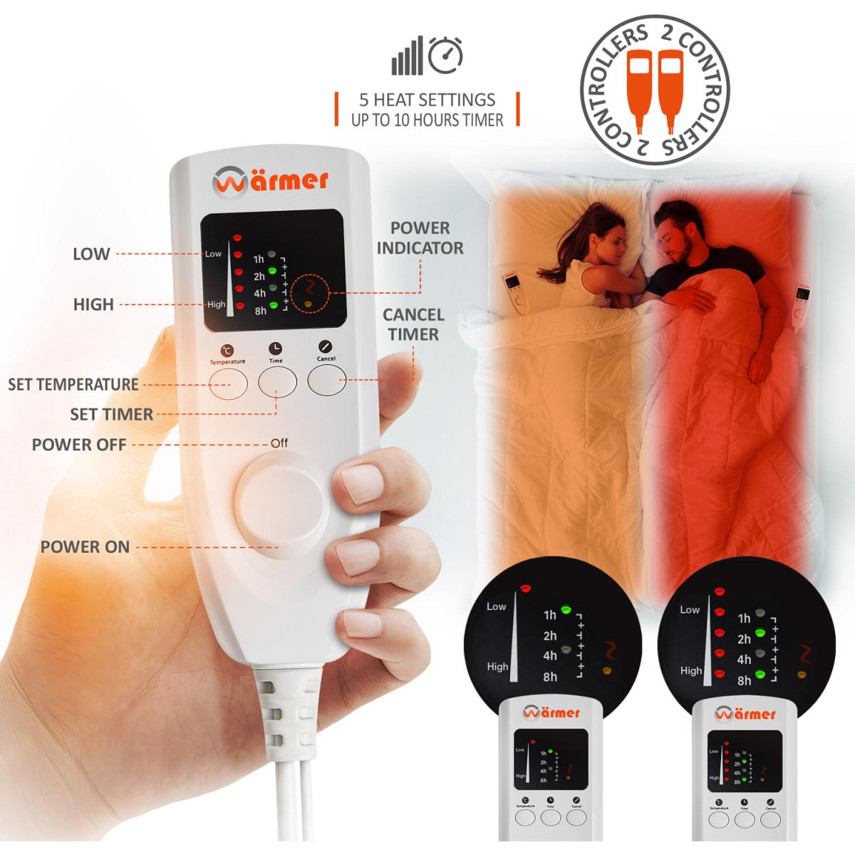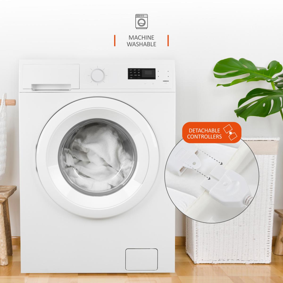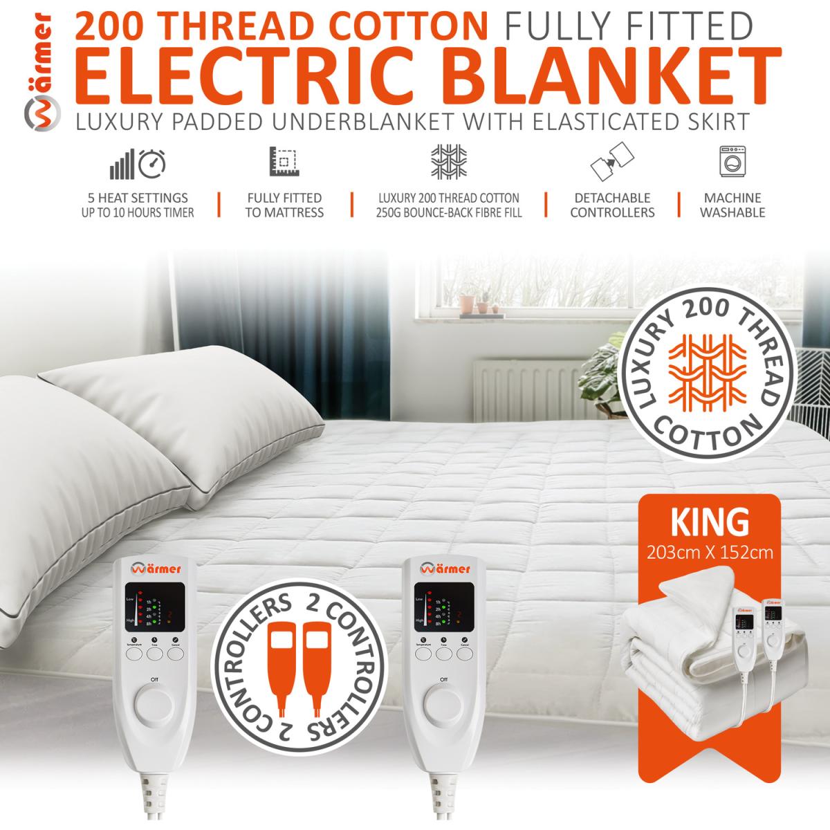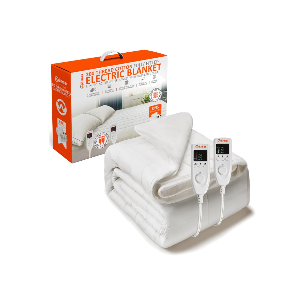 This WARMER Fully Fitted Cotton Electric Blanket is the ideal way to stay cosy and warm when the evenings get chillier. It is made from luxury 200-thread cotton with 250g bounce-back fibre padding for extra comfort. With two independent controllers, a ten-hour timer and five different heat settings, this blanket is guaranteed to keep you feeling snug during the colder nights. This blanket runs off 120W of power meaning you could run both sides of the blanket on the highest heat setting for 3 hours and it would cost you 12p a day. This means you can stay warm and cosy this winter without having to worry about a huge increase in your energy bills. This blanket features five different heat settings that can be operated by a dual remote system. This means different sides of the bed can be heated to different temperatures making it perfect for couples. The blanket also comes with a built-in overheat and overcurrent protection system that works from the first time the product is plugged in. This will automatically shut down the blanket if it overheats or receives too much power meaning you can relax whilst using this product. This blanket comes with a fully fitted skirt meaning it is easy to fit it onto your bed. The dual controllers are detachable and the blanket is made from 100% polyester which means it can be machine washed at low temperatures.