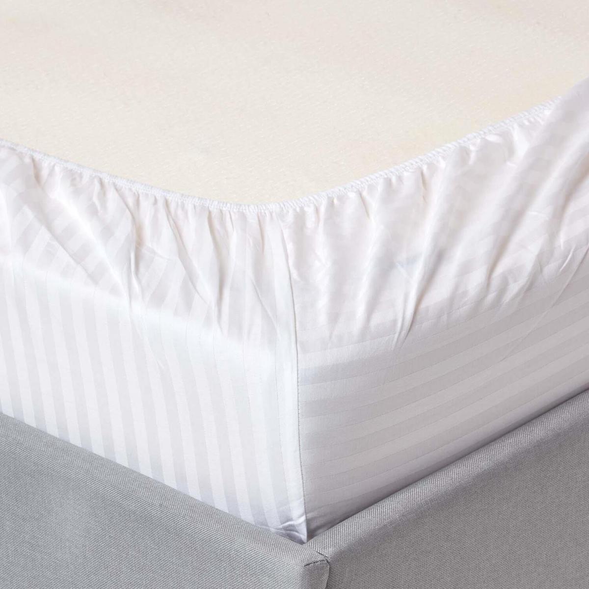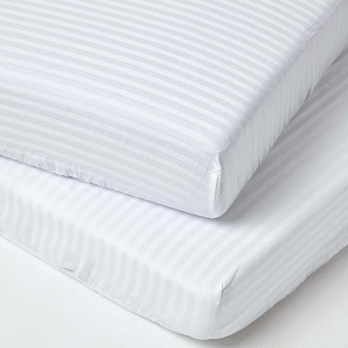 Set of 2 white Egyptian cotton striped cot bed sheets. Washable, hypoallergenic and perfect for baby soft skin, this two-pack of toddler bed sheets are durable and super soft. White Cot Bed Fitted Sheets Woven from the purest Egyptian cotton, Homescapes' pair of white cot bed sheets are a classic addition to any nursery. Naturally breathable, hypoallergenic and anti-dust mite cotton is the perfect choice for baby bedding, keeping your child warm in winter and comfortable in summer, wicking away any moisture so that your child gets the perfect night's rest. Striped Cot Bed Sheets Homescapes pair of delicately striped white toddler bed fitted sheets can be washed at 60. C and will become even softer with use. Measuring 70 x 140 cm and 15cm deep, each cot bed sheet is fully elasticated, keeping your baby sheets in place, even as your child wriggles around. *This fabric has been commissioned by using single ply finely combed pure cotton yarns to provide a higher density fresh and crisp percale. These single ply yarns, even though have 330 threads per square inch of weaving, the resultant fabric is far superior than most multiply yarn fabrics with an alleged 500 thread count. Matching cot sheets, children's duvet cover sets and pillow cases also available.