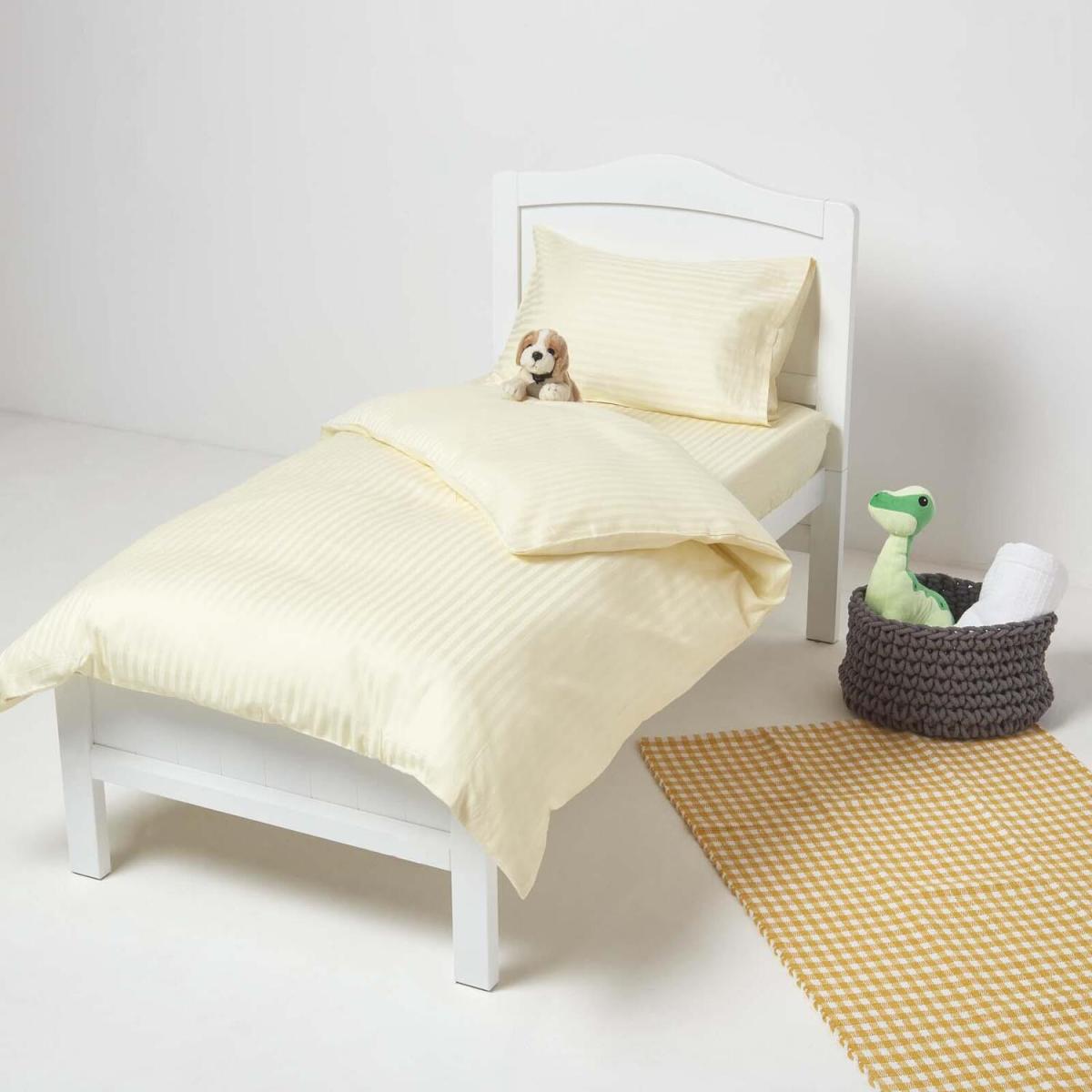 A British company, established in 2000, Homescapes are specialists in high-quality bed linen for all ages. We dont just buy our bed sheets, we build them. Beginning by hand picking the purest cotton fibres to finely combing and spinning the yarn in the finest spinning facilities to our required specifications. We select the weaving machines to weave our fabrics and the processors to dye them always ensuring that your children bed linen serves your child for years and leaves a unique, fresh experience that only cotton can provide each time your child goes to bed. Super soft and durable, Homescapes childrens cotton bed linen is anti-dust mite and naturally hypoallergenic making it the perfect choice for baby soft sensitive skin. This super soft exclusive range is created using single ply (40s) super combed yarn, woven in a plain percale weave. Naturally hypoallergenic and anti- dust mite Homescapes 100pc cotton cot sheets and cot bed sheets are perfect for young children and toddlers, kind to sensitive skin the natural fibres wick away sweat, allowing them to stay comfortable throughout the night. In a single square inch, 200 yarns are woven making it equivalent to 400 thread count twisted yarns. When compared with sheets made with twisted yarns (as most are), Homescapes durable single ply will last much longer and becomes even softer with every wash perfect for even the softest babys skin. Homescapes developed this affordable but high-quality range in 2008, one of our most popular ranges, now available in six colours. Fitted sheets are fully elasticated (not just in the corners) and are extra deep, ensuring the sheet remains in place as you child moves.
