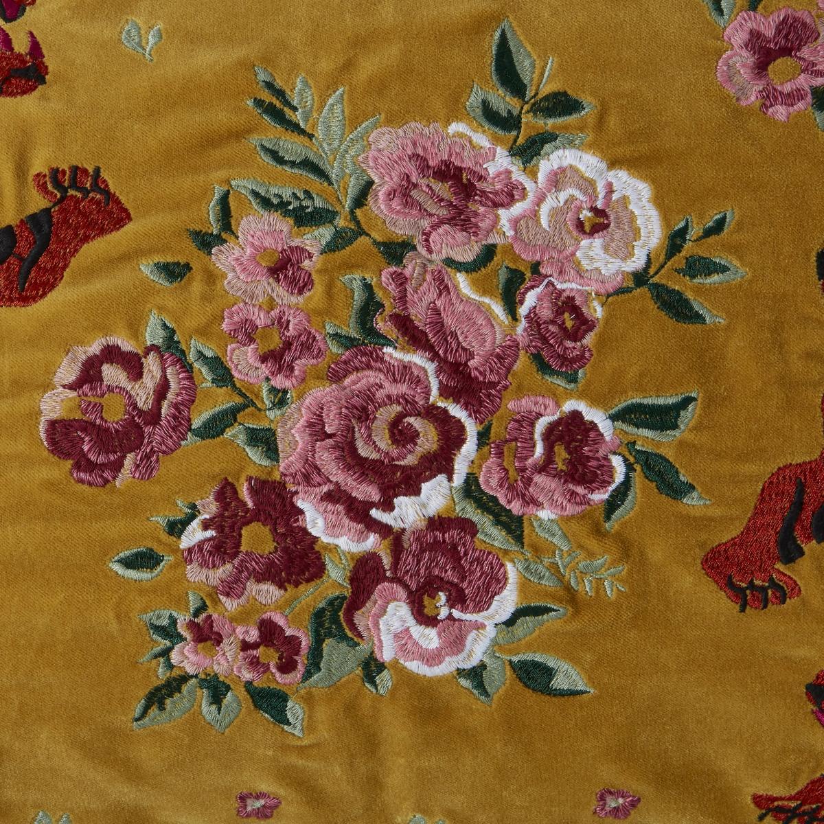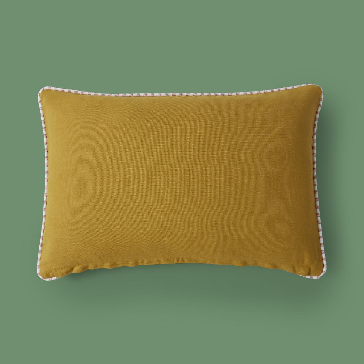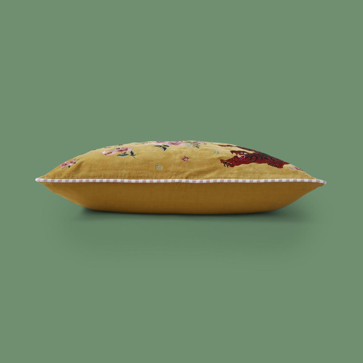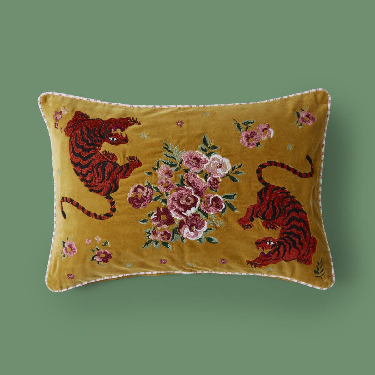 * Embroidered Tiger detailing* Filled cushion Fashioned with beautiful hand embroidered detailing, this Cotton Velvet Tiger cushion is finished with a cheery, striped contrast piping. The case is crafted from Better Cotton with a plain reverse colour matching the ochre face. Filled with a recycled polyester hollowfibre for lasting fullness, this cushion provides maximum comfort when relaxing in your home and adds a bohemian touch to your favourite seat.