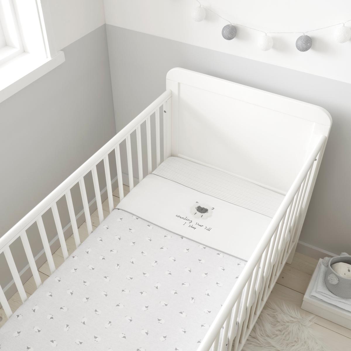* Polyester Fibre Filling* Cool 4 Tog rating* Reversible design with embroidered details* Super soft and Breathable 100% Cotton Cover* Machine Washable, Tumble dry on a low heat setting Featuring an adorable Counting Sheep design, this coverless cot quilt is a delightful addition to your little one's bedding. With a 4 tog rating and polyester fibre filling, it provides lightweight warmth while staying soft and snug. Made from 100% cotton, the quilt is naturally breathable and easy to maintain, eliminating the need for a separate duvet cover. Plus, its reversible design offers two charming patterns in one, adding extra versatility and fun to your baby's bed.
