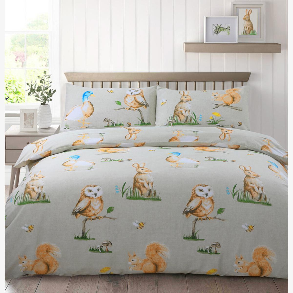 Embrace the beauty of the countryside with our hand-painted duvet set. Immerse yourself in the enchanting world of beloved country creatures, including Mr. Rabbit, Mrs. Duck, Master Owl, and Miss Squirrel, all nestled within a picturesque country wonderland. Vibrant pops of color adorn the scene, from delicate flowers and mushrooms to buzzing bees and lush grass, creating a visual symphony of yellow, green, and blue hues. Crafted from a premium blend of poly-cotton, this duvet set boasts durability, fade resistance, and minimal creasing, ensuring it maintains its charm wash after wash. Lightweight and breathable, it promises a comfortable night's sleep all year round. Plus, with its machine-washable design, upkeep is a breeze. Each set includes one pillowcase for single beds and two for double, king, and super king sizes, providing a cohesive look that effortlessly elevates your bedroom decor. Indulge your love for the countryside and add a touch of whimsy to your sleep sanctuary with this delightful duvet set today!