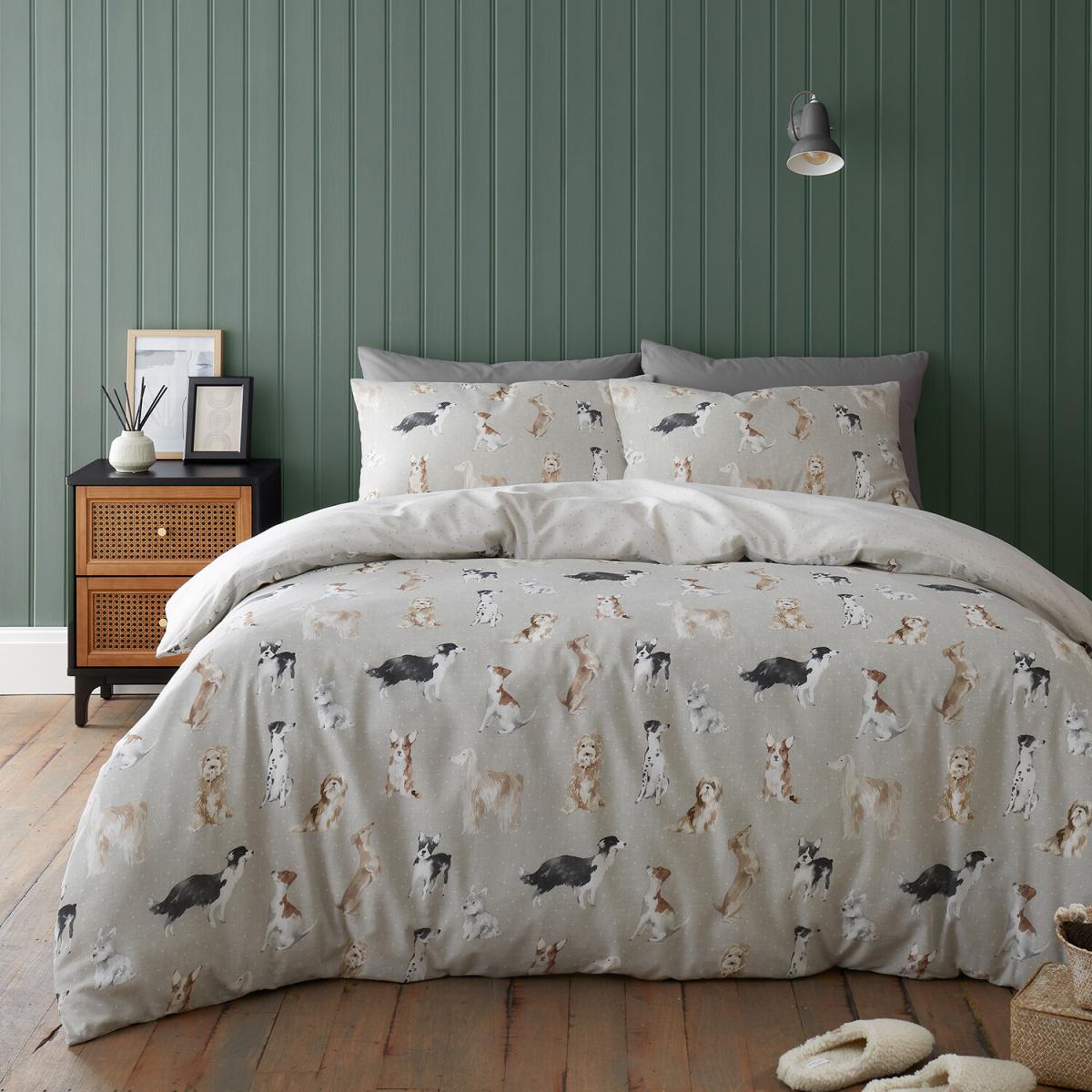 Featuring a trendy neutral colour scheme, this Country Dogs Duvet Cover and Pillowcase Set is sure to give your bedroom some rustic charm. Offering a pattern of adorable dogs and a delicate polka dot, this Divante exclusive bedding is great for canine lovers! The reversible design provides two styles in one for variety while the polycotton material gives easy care and comfort.
