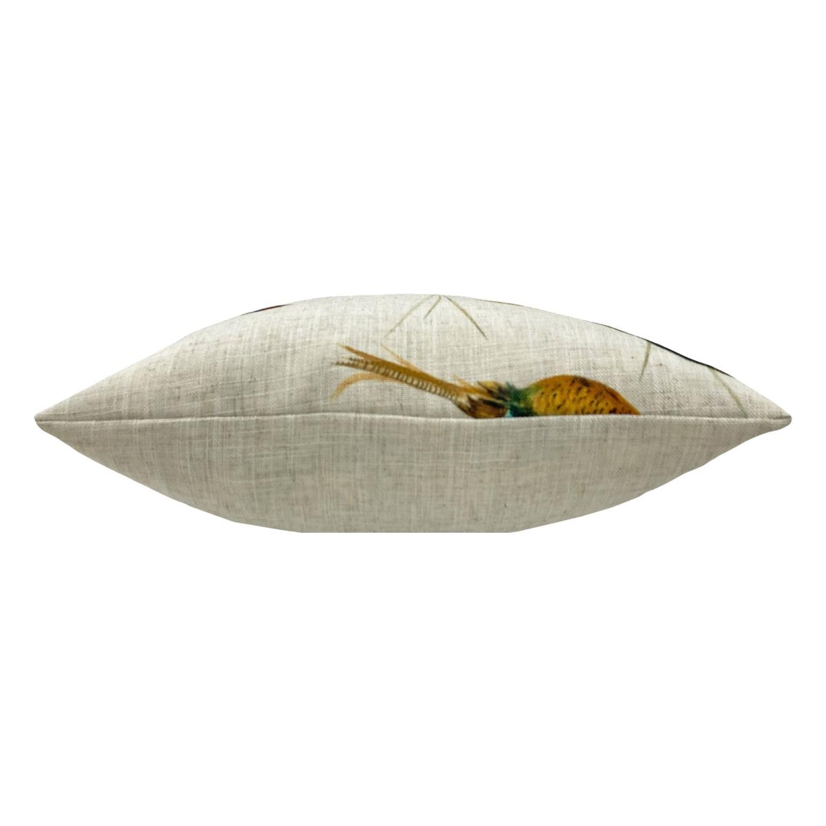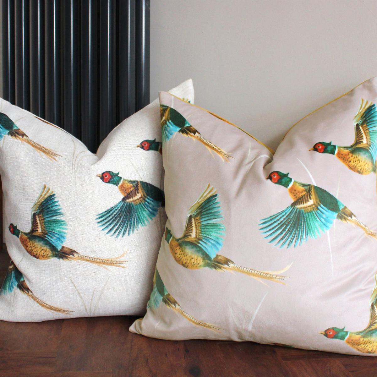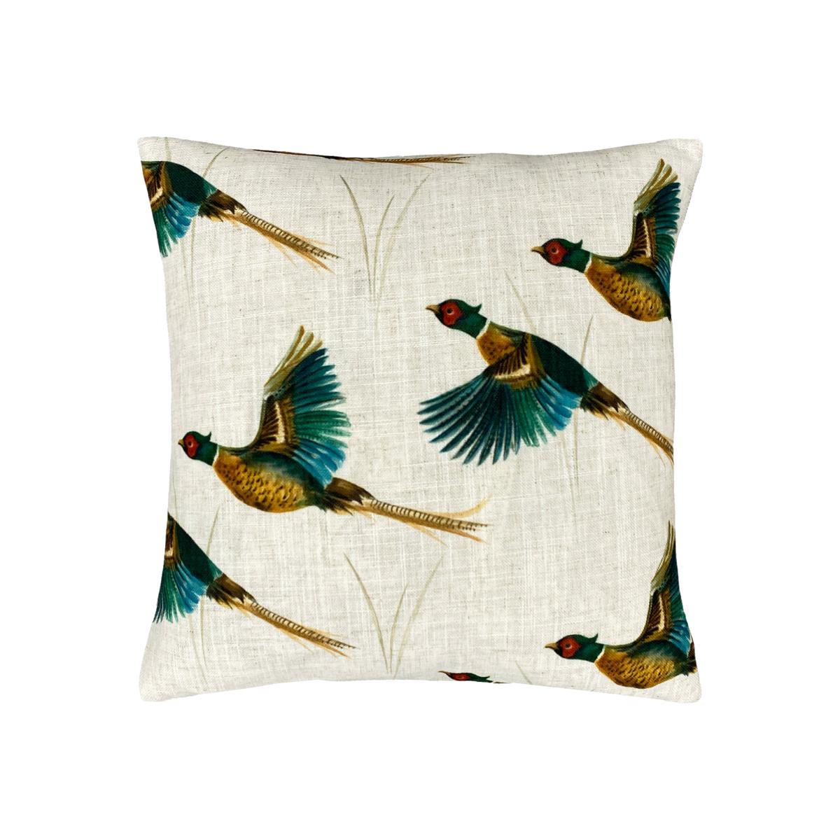 Effortlessly style up your chair, sofa or bed with the help of our Country Flying Pheasants Cushion. Featuring a repeating design of flying Pheasants on a linen-look fabric. Complete with standard knife edging and a hidden zip closure. Made of 100% Polyester, this cushion is super soft yet durable.