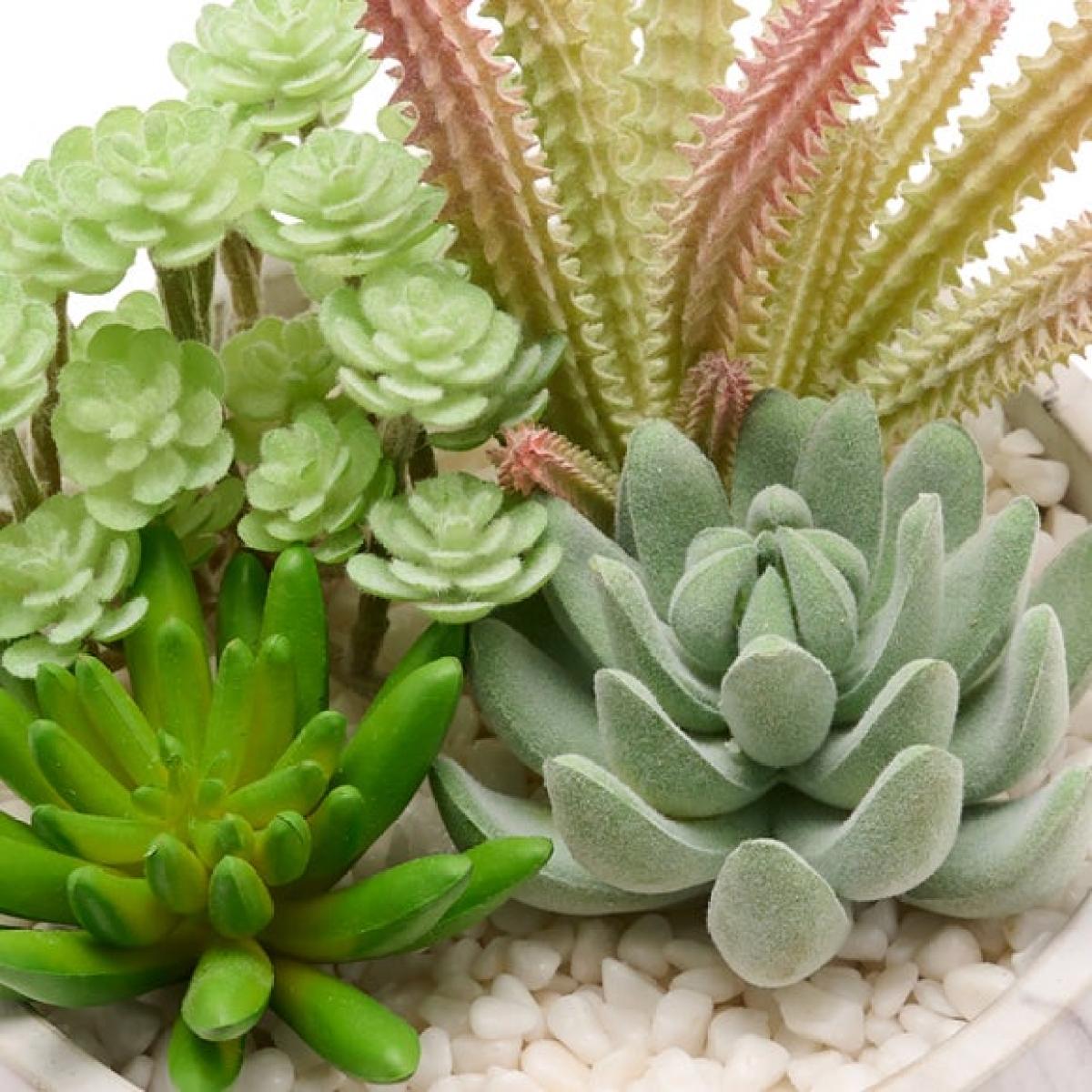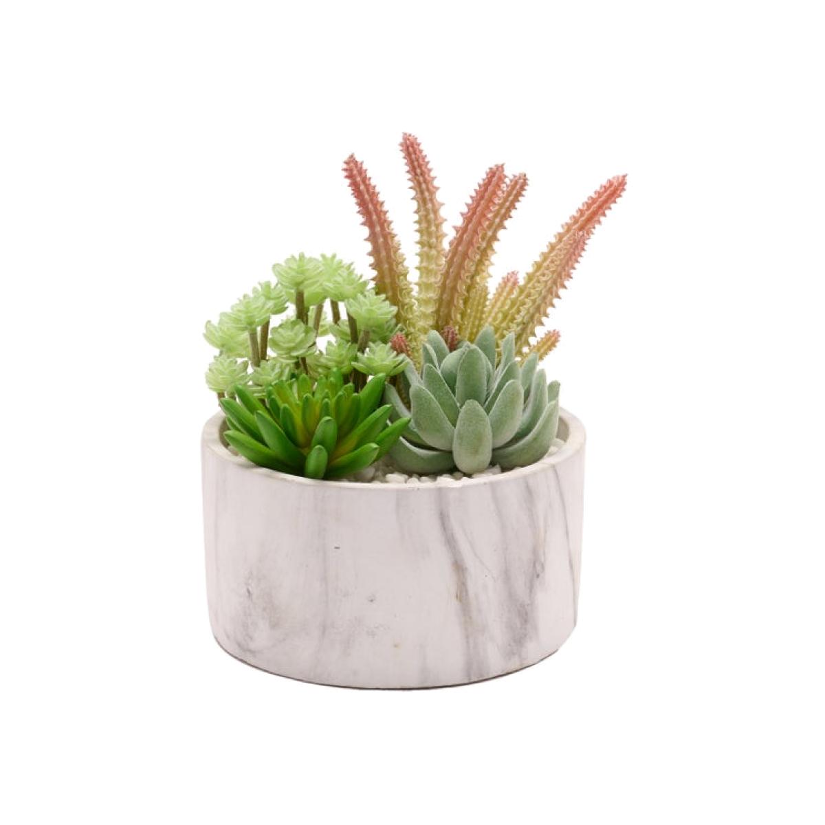 * Artificial plants * Marble effect concrete pot * Instant colour for your home * No maintenance needed Add instant greenery to your home with these Artificial Mixed Succulents in a Marble Effect Plant Pot. Featuring a contemporary style round marble effect pot, these realistic looking beauties are perfect for less-than-ideal growing conditions and don't need watering. They're ready to brighten up your office, living space or entryway all year round with their multiple textures and colours.