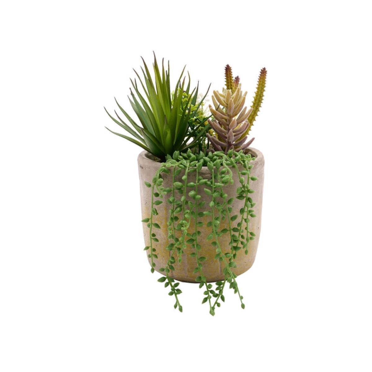 * Mix of artificial succulents * Stoneware plant pot * Trailing interest * No watering needed This mixed artificial succulent arrangement features trailing String of Pearls along with Giant's Watch Chain and Aloe Vera plants, making this a lovely varied assortment. Needing no watering, these realistic succulents are all housed in an attractive stoneware pot, and are ready to place anywhere in your home for instant colour and interest all year round.