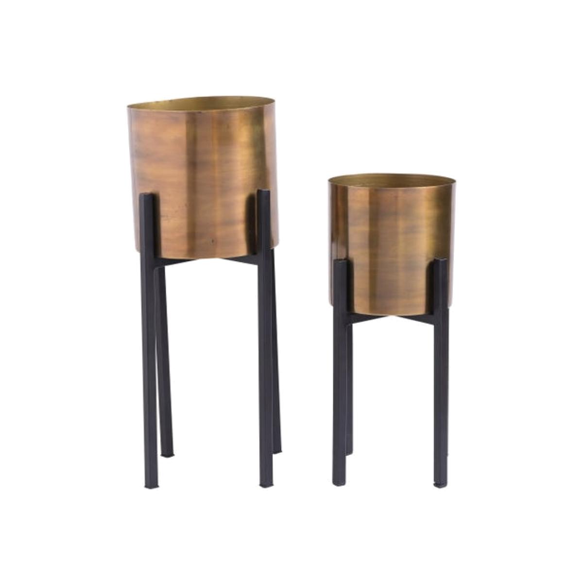 * Set of 2 * Straight sided plant pots * Golden bronze colour * Black metal stands * Indoor use This set of 2 plant pots and stands are sure to make a statement. Perfect for adding height to your floral displays, this set includes two different sized golden bronze metal plant pots with black metal stands, ideal for holding your favourite houseplants. With their modern design, this set would be a great addition to contemporary or industrial decor styles.