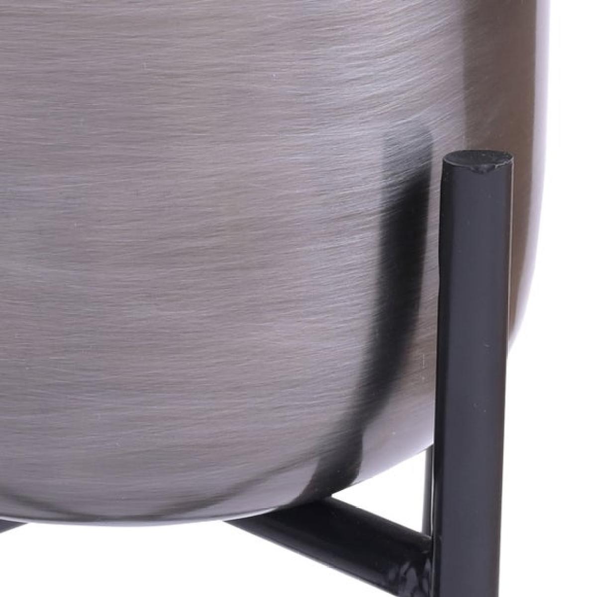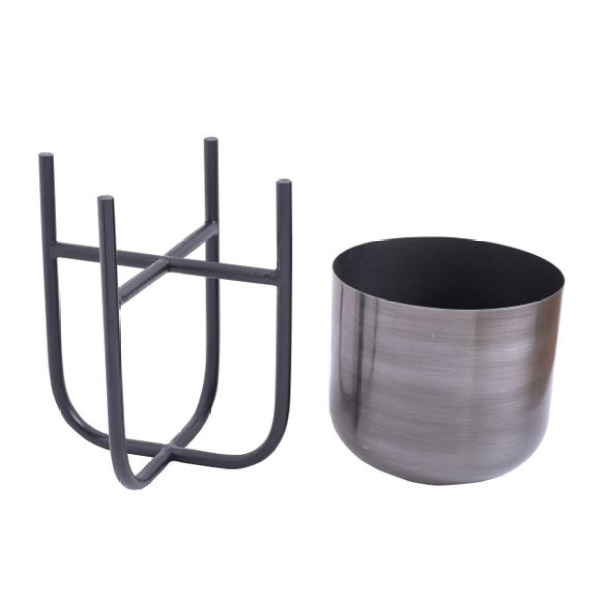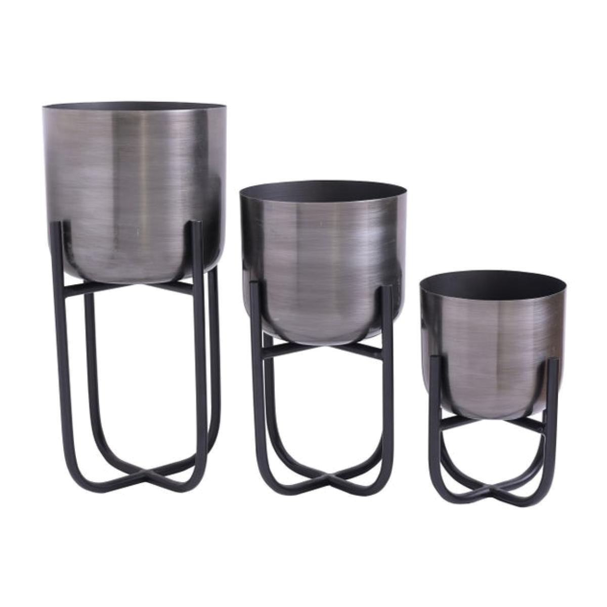 * Set of 3 plant pots * Each come with a black stand * Metal construction * Pewter coloured finish * Indoor use Add height and drama to your plant displays with this set of 3 small, medium and large plant pots and stands. With their modern design, finished in a pewter colour with black stands, this set is sure to make an impact, and would suit a range of decor styles.