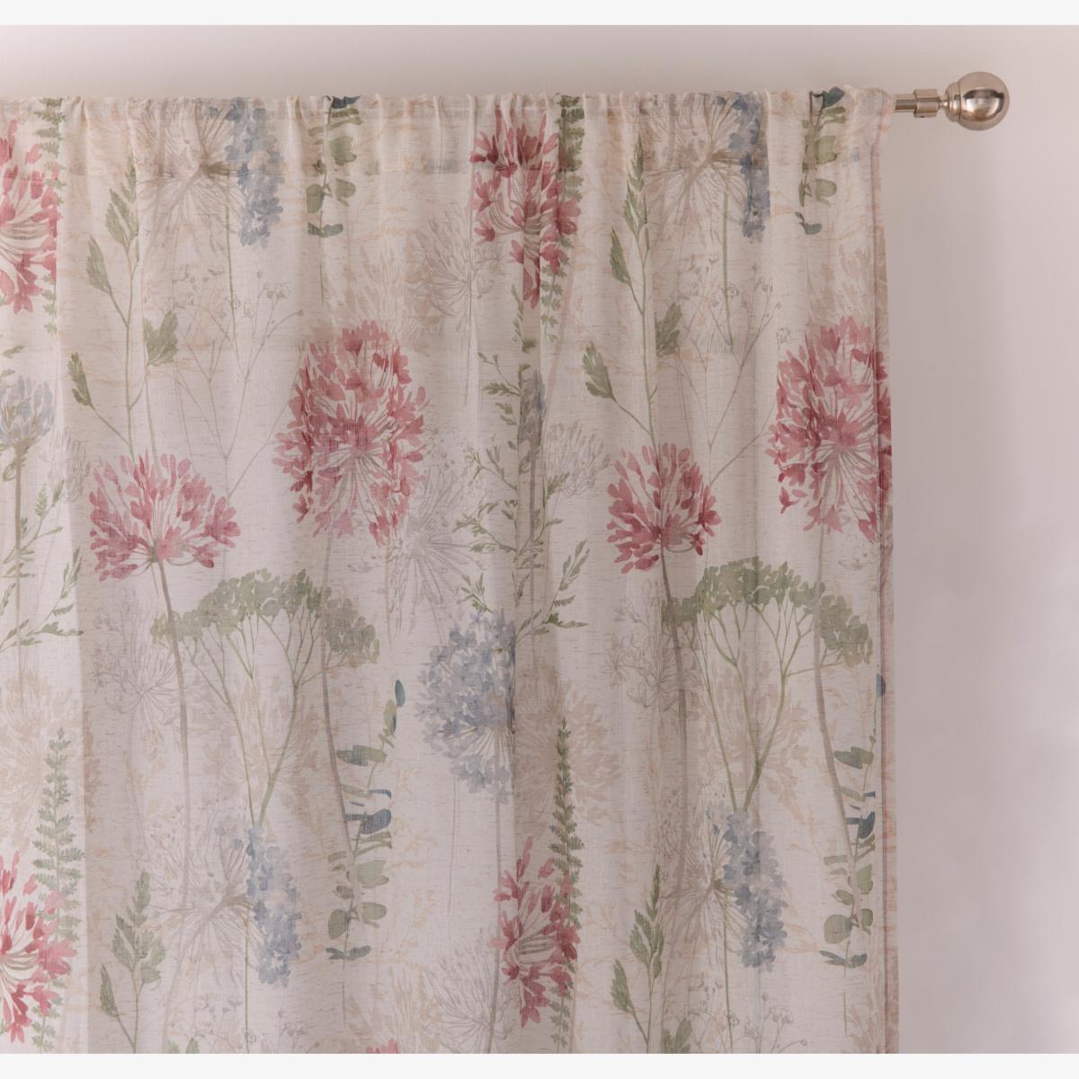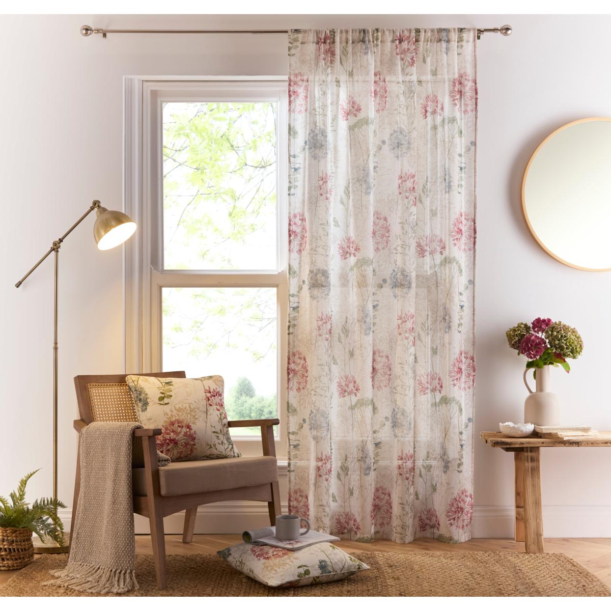 * 1 x Voile Panel* Stunning Floral Design* Linen Blend Woven Fabric - Lovely Drape & Lightweight Feel* Slot Top Header - Easy to Hang* Available in Multiple Sizes Meet the Country Meadow Slot Top Voile Panel, which features a beautiful floral design with accents of blue, pink, and natural tones. Printed onto a linen blend woven fabric, it offers a lovely drape and lightweight feel for any room.