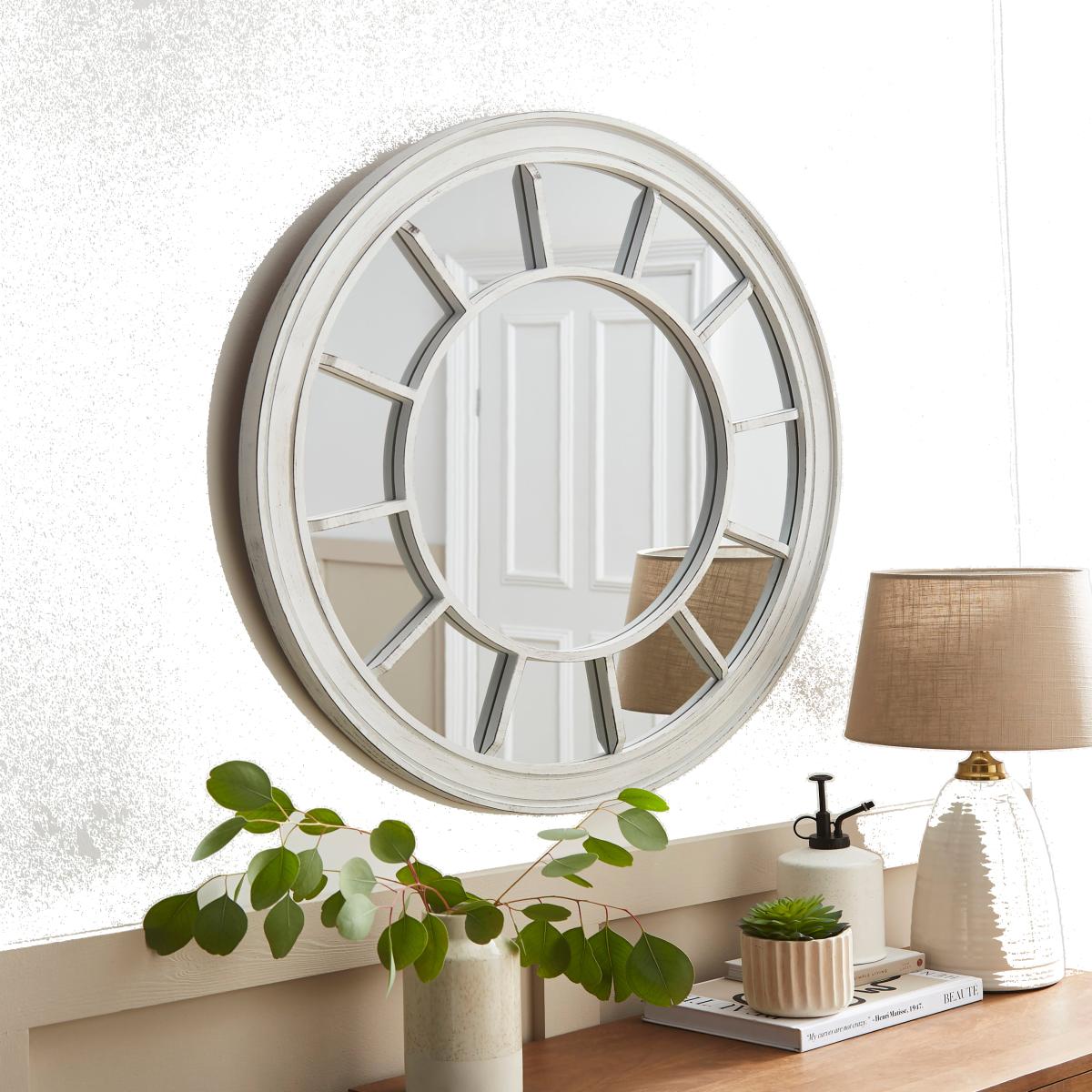 I love this round wall mirror for its charming country vibe, making it a versatile piece that works well in both traditional and rustic interiors. Its cream finish gives it warmth and softness, perfect for creating a cosy, inviting atmosphere. The open, clock-like design adds visual interest without overwhelming the space, making it ideal for hallways, living rooms, or even bedrooms. When styling, try pairing it with natural materials like wood or wicker, and complement with warm-toned accessories for a harmonious look. For a practical tip, place it above a console or sideboard to reflect light and bring a sense of space to smaller rooms.