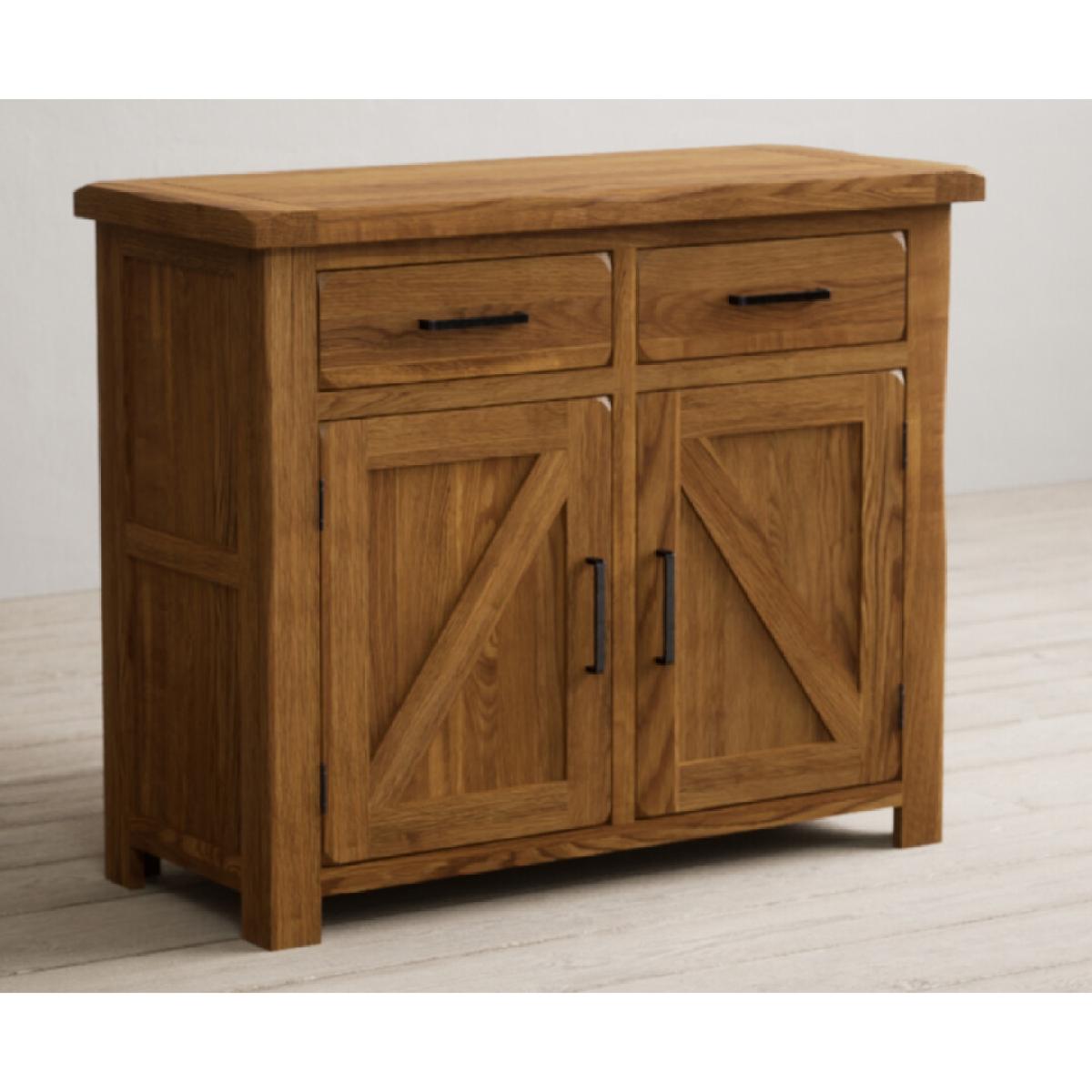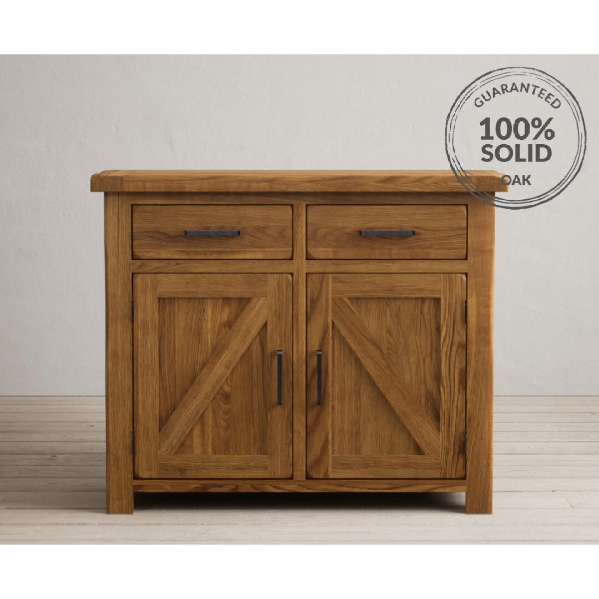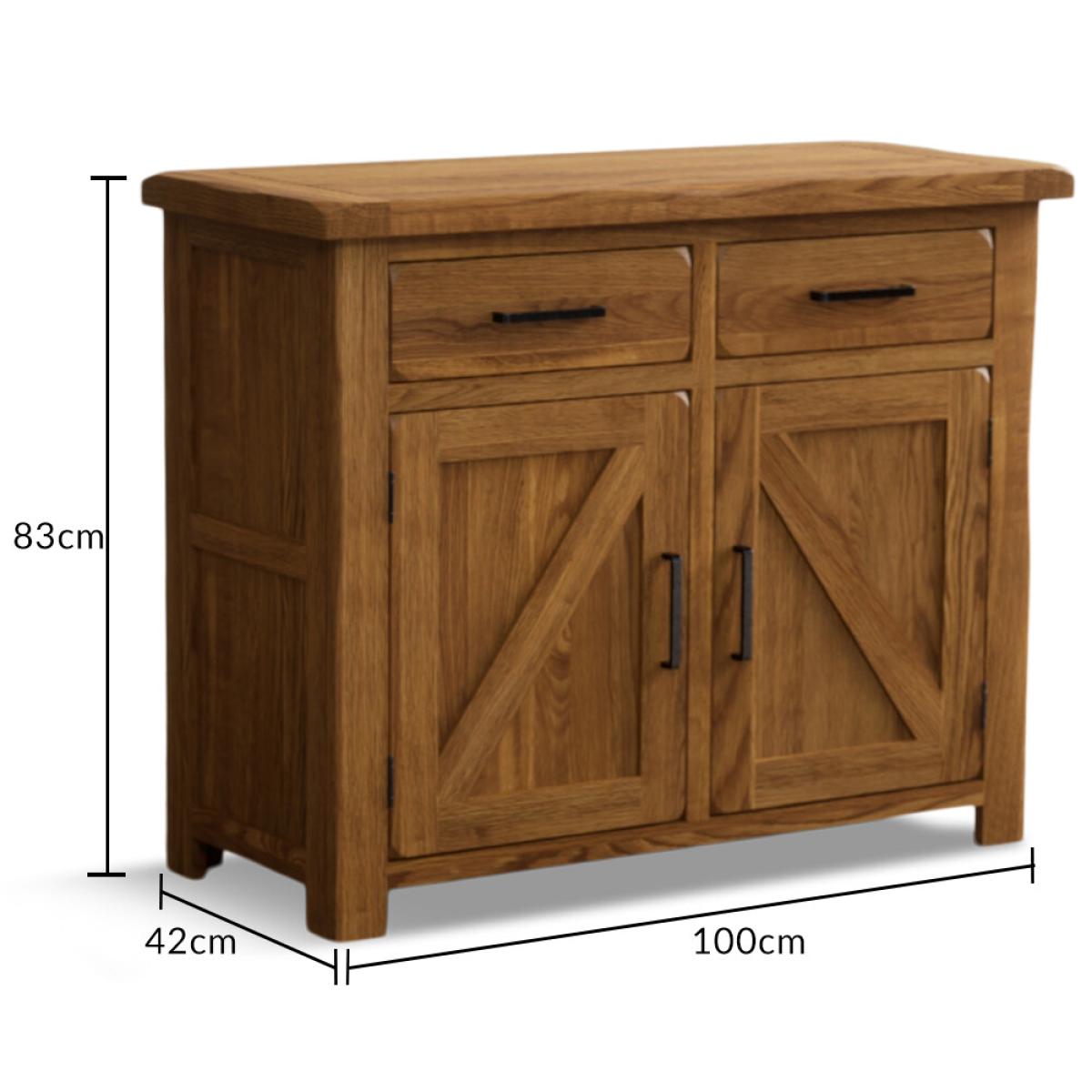 The Country Rustic Solid Oak Small Sideboard is crafted from 100% solid oak with a rustic finish and features dovetail drawers with wooden runners and metal handles.