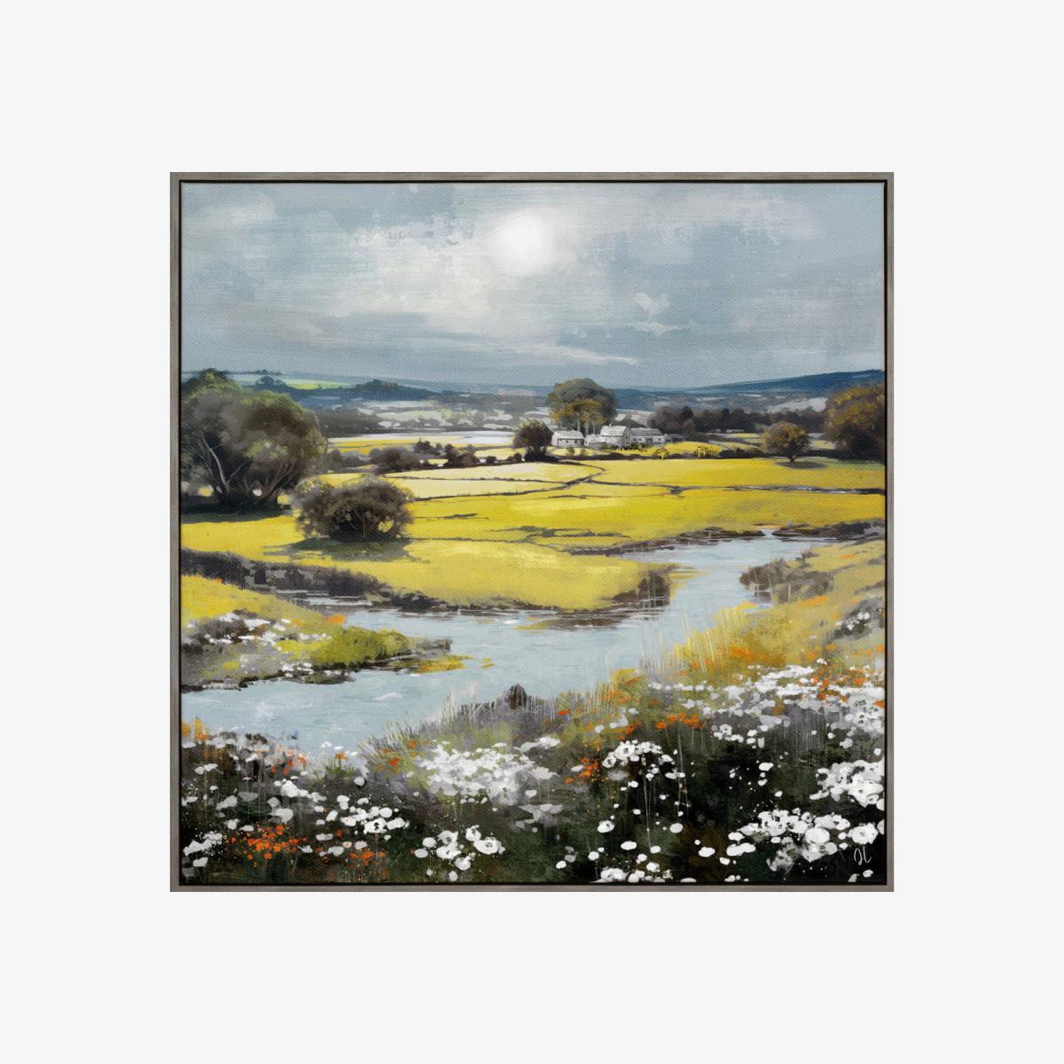 Immerse yourself in the beauty of the English countryside with this captivating artwork. This piece showcases a vibrant wild meadow bursting with colour, a gentle river winding through the landscape and a dramatic sky that adds depth to the scene. The rich hues and expressive brushstrokes bring the rolling fields and serene water to life, creating a sense of tranquillity in the home.