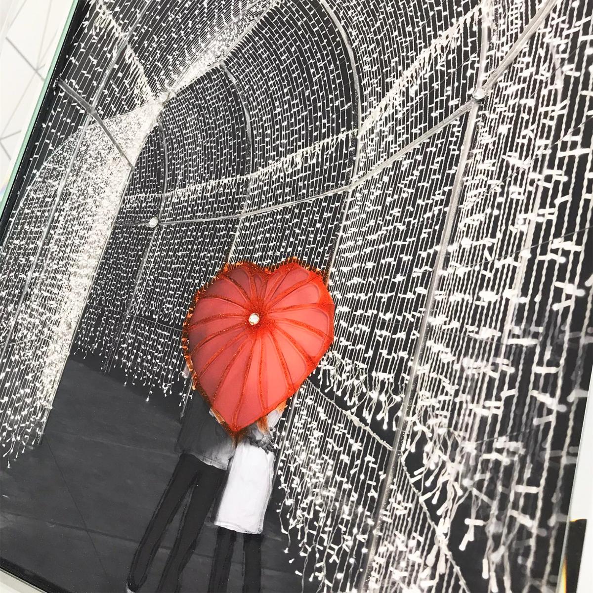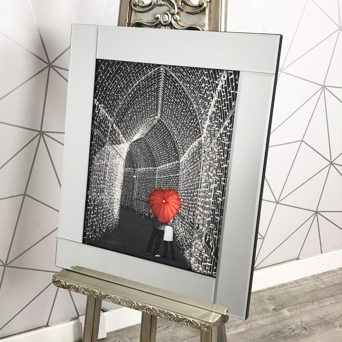 Romantic wall art boasting diamonte finish. Beautiful liquid art wall art depicting a romantic stroll. Featuring a couple with a red heart umbrella beneath the twinkling lights. The wall art is completed with liquid glitter details and a contemporary mirrored frame. Perfect for use in any lounge, hallway and bedroom.
