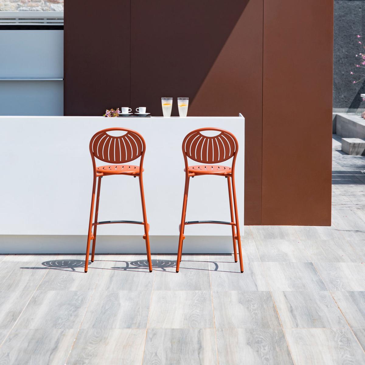 The Coupole high garden stool is a contemporary, poetic reinterpretation of the traditional bistro chair. The singular motif that decorates the backrest and seat is inspired by the shapes of Brunelleschi's Dome. This high steel garden stool is available in a contemporary colour palette. It can be stacked up to 4 items high and withstand bad weather. With more than fifty years’ experience in metalworking, Emu expresses its style in gardens and on terraces all around the world. Emu creations have become icons in the world of "made in Italy" design and quality. Emu carries out and controls all the production stages within its factory in Marsciano, in the heart of Umbria. All phases of the production process are subject to rigorous checks.