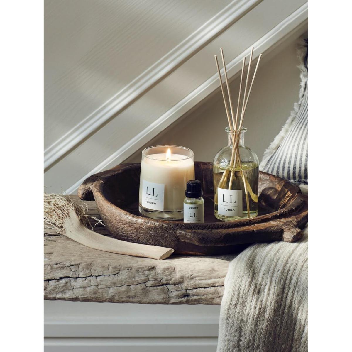 Couro is Portuguese for leather, rich and evocative this fragrance perfectly ignites memories of roaring fires, vintage leather and a fine cognac. An indulgent scent, with a hint of spicy jasmine and woody cedar, it simply wraps you in its arms, comforts and yet excites you.  Perfect company for a cold damp evening.