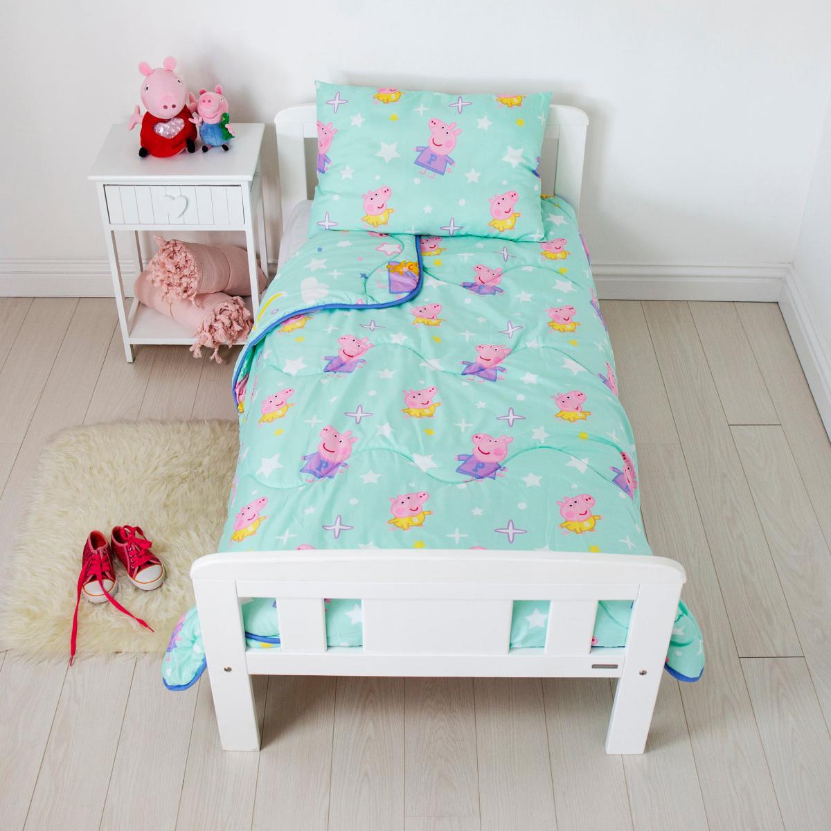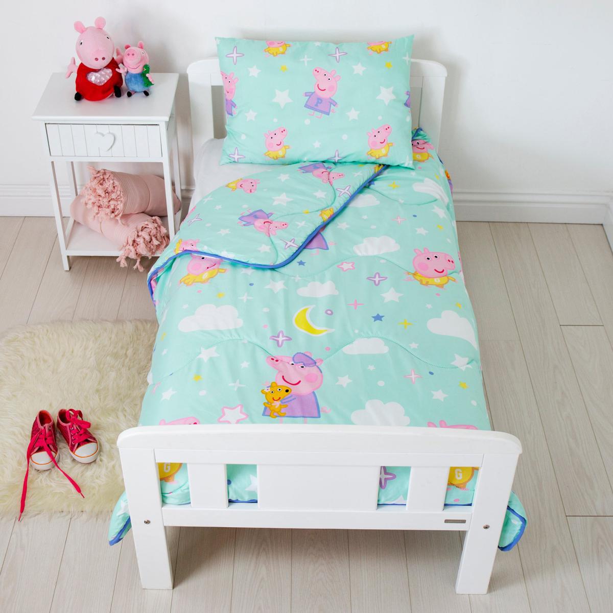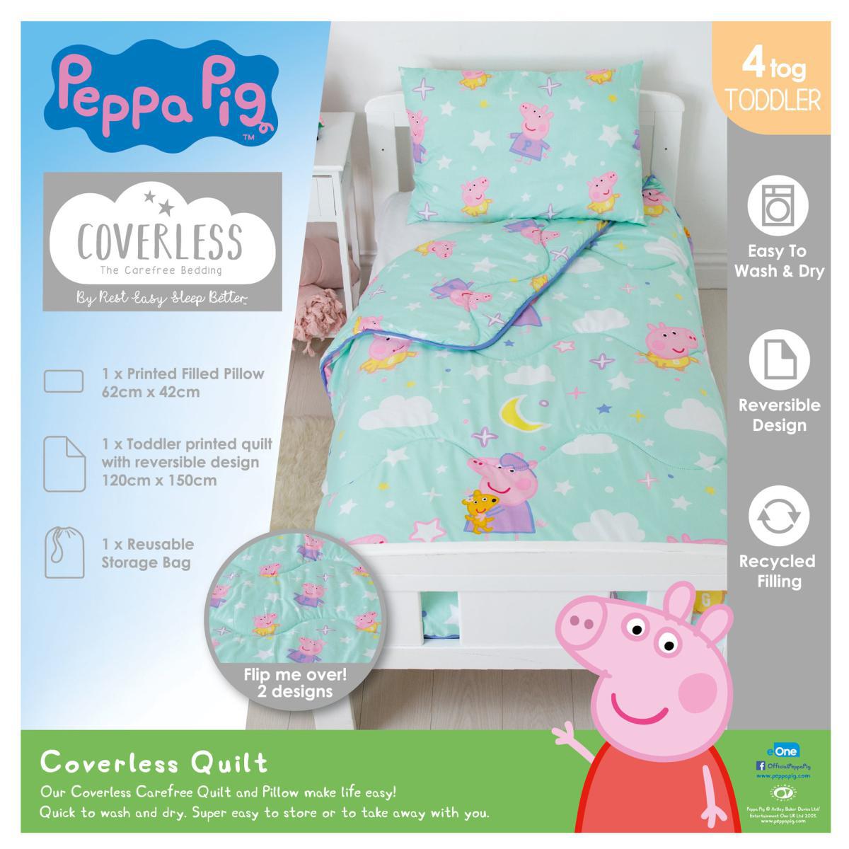 Make life easy with this No Cover Needed Washable Peppa Pig quilt. No more wrestling with your duvet cover with this Coverless Carefree Bedding, it has never been easier just simply pop the whole thing in the wash, then when it is dry put it back on the bed. This set is easy to wash and dry for better hygiene. We’ve designed this set to easily fit into most domestic washing machines, not only that, they are easy to dry you can tumble dry on cool setting or line dry either way your Coverless Carefree Bedding can be dry and back on your bed in no time at all. We are so happy that you can take a piece of home with you wherever you travel, simply roll and “squish” into the handy carry bag – perfect for sleepovers or those long awaited staycations. This set includes a reversible quilt, matching pillowcase, pillow and a matching drawstring bag which is great for storing or taking with you. Made from soft touch microfiber with a 4 tog rating this is the ideal item for snuggling up with on a sofa on a chilly evening. This set is filled with GRS Certified Recycled Polyester Fibre. This Collection is verified by OEKO-TEX® and independently tested for harmful substances. It stands for customer confidence and high product safety. WARNINGS:. TOGS AND WHAT TO WEAR. Room Temperature:.