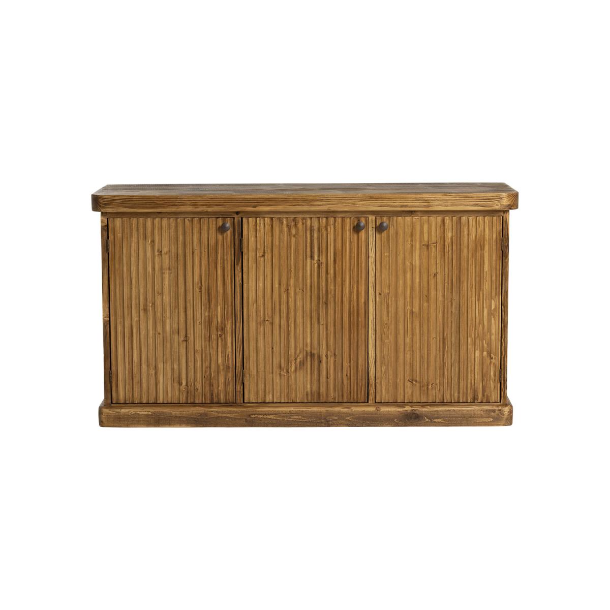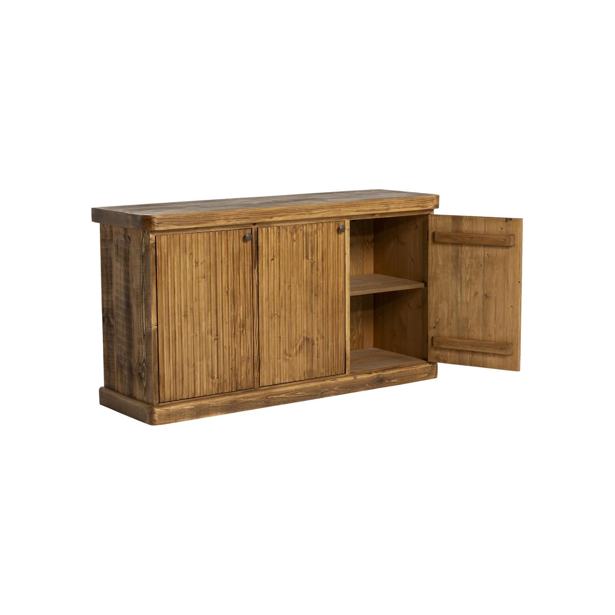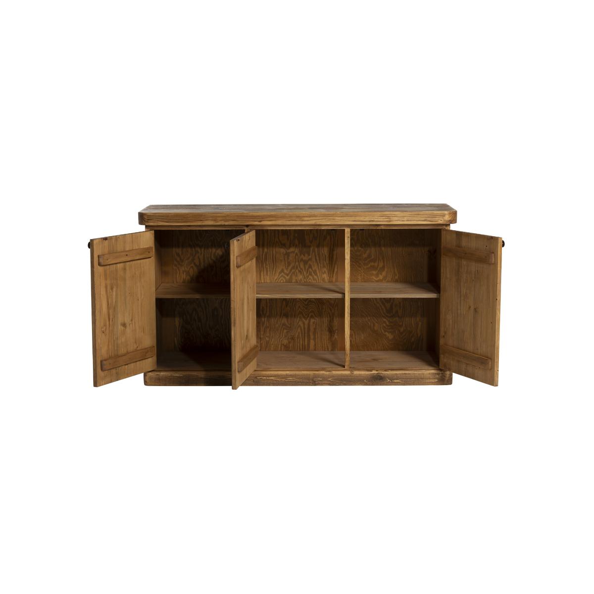 Crafted from the venerable and storied timbers of reclaimed conifer, the Reclaimed Wood 3 Door Sideboard breathes new life into your dining space with rustic splendour. Each aged plank, seasoned by time and nature, showcases the enchanting beauty of repurposed wood, its rich, weathered patina a testament to the journey of years gone by. The sideboardrsquo;s three doors, sturdy yet gracefully designed, open to reveal ample storage, making it as functional as it is beautiful. Every grain and knot whispers a tale of history, lending unique character and charm to this exceptional piece. This sideboard is more than just furniture; it is a tapestry of naturersquo;s artistry and human craftsmanship, a symbol of sustainability, and a warm, rustic embrace for your home