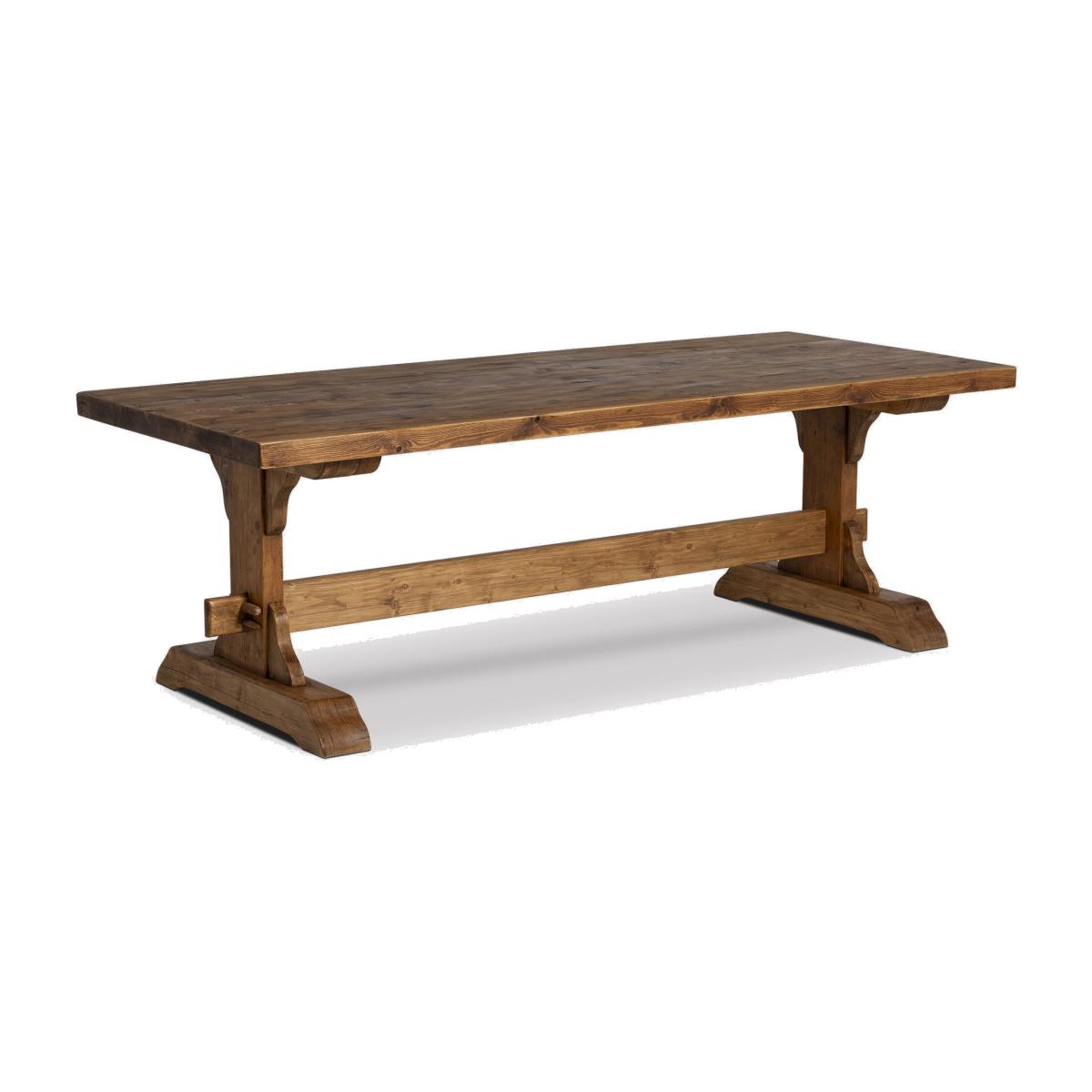 I’m a fan of the Covington table for its robust, polished timber top and simple trestle base - it brings warmth without feeling fussy. Its generous 240 cm length means it easily seats eight, so it’s perfect for family dinners or entertaining friends. It works equally well in modern-scandi schemes when paired with slim black metal chairs, or in a relaxed farmhouse setting alongside upholstered benches. For styling, keep the surface clear except for a neutral runner and a low greenery-filled bowl, and layer a natural-fibre rug underneath to anchor the space.