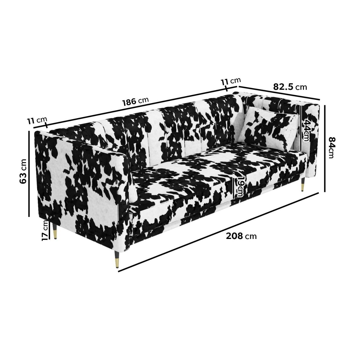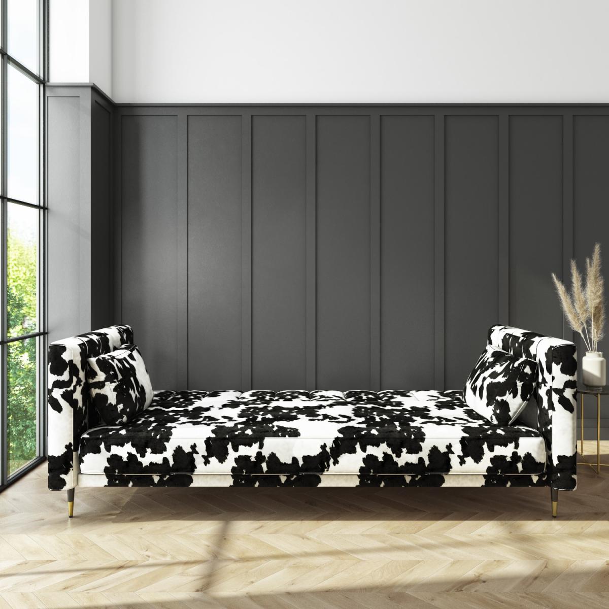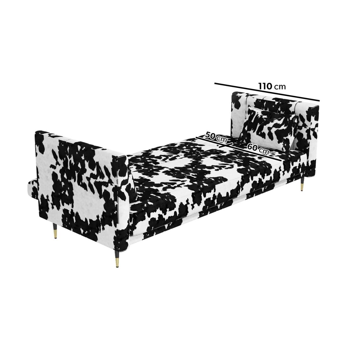 No guest room? No problem. Easily transform this sofa when you need an extra bed This sofa extends to become a spacious 110cm wide bed Click-clack mechanism for ease of use Foam filled and with a sprung base Colour: Black and white cow print Two matching plump cushions included for added comfort Also available in mustard yellow, grey or beige, there's a Mabel sofa bed to suit your room Need to know Packaging weights: Box 1: Weight 37.5g / Box 2: Weight 14kg Colour: Black and white Finish: Cowprint upholstery and metal legs Filling: Spring and foam filled Mechanism: Click-clack Assembly required: Yes