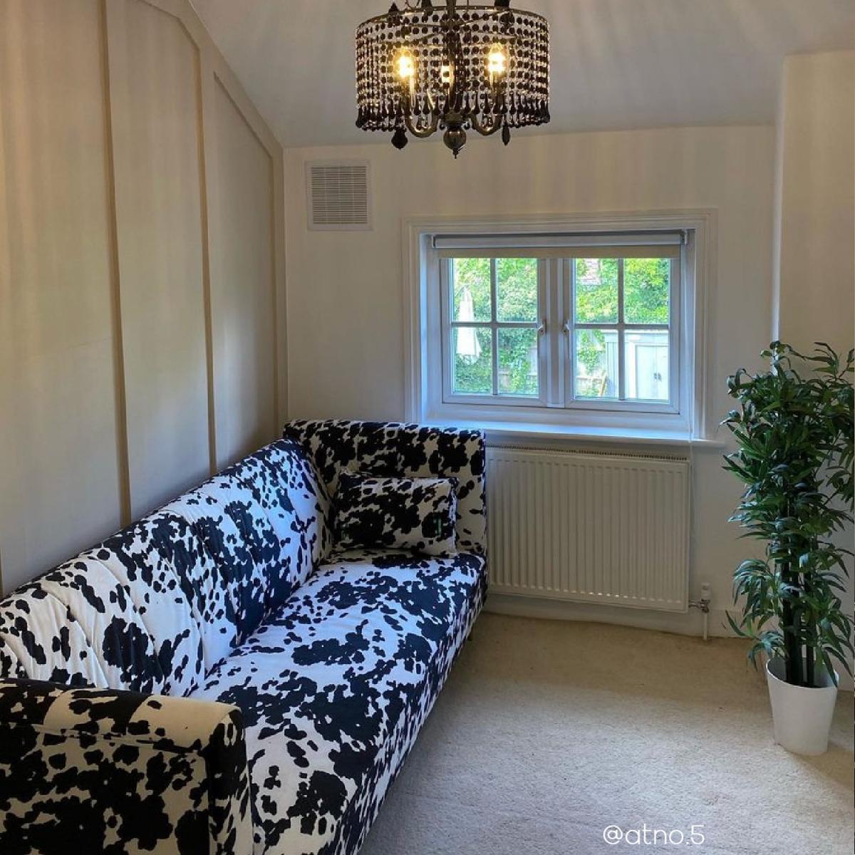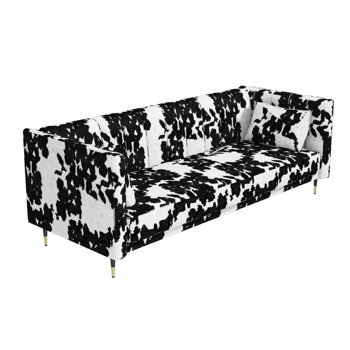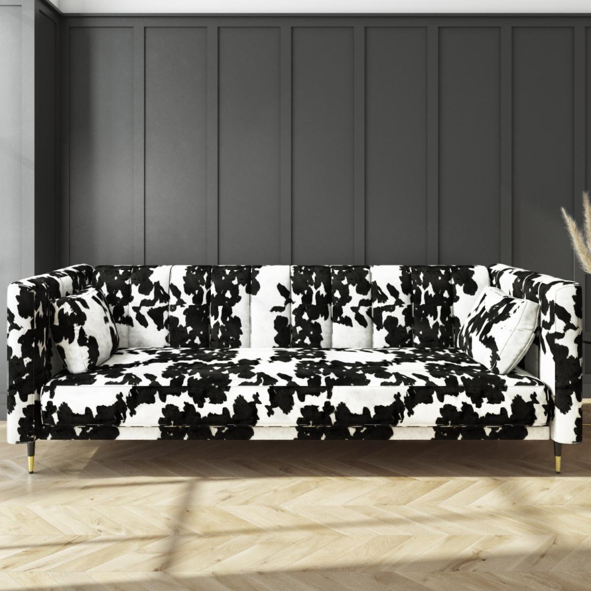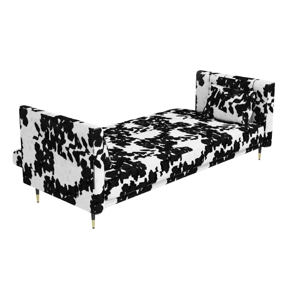 No guest room? No problem. Easily transform this sofa when you need an extra bed This sofa extends to become a spacious 110cm wide bed Click-clack mechanism for ease of use Foam filled and with a sprung base Colour: Black and white cow print Two matching plump cushions included for added comfort Also available in mustard yellow, grey or beige, there's a Mabel sofa bed to suit your room Need to know Packaging weights: Box 1: Weight 37.5g / Box 2: Weight 14kg Colour: Black and white Finish: Cowprint upholstery and metal legs Filling: Spring and foam filled Mechanism: Click-clack Assembly required: Yes