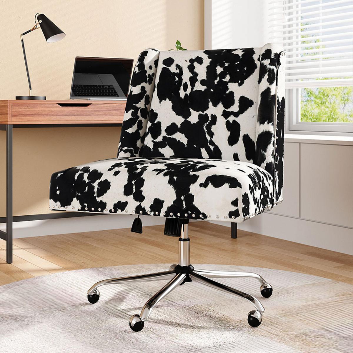 Ideal for both the home office and study, this modern swivel chair from Livingandhome brings a fun and stylish twist to traditional office seating. Featuring a bold cow print design, it stands out as a statement piece while effortlessly blending into contemporary interiors. The eye-catching pattern adds personality and charm, showing that office chairs can be just as expressive as they are functional. Upholstered in luxuriously soft velvet, the chair offers a smooth, wrinkle-free surface and a feather-like touch that enhances your comfort throughout the day. It's a perfect balance of practicality, comfort, and distinctive design.