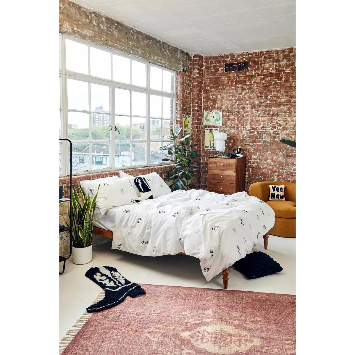 Cutesy cowboy boot motifs top this soft cotton duvet cover set. Includes a duvet cover and two matching pillowcases, complete with a boot print that adds western vibes to your bedroom. **About Better Cotton** \- By choosing our cotton products, you’re supporting our investment in Better Cotton’s mission \- This product is sourced via a system of mass balance and therefore may not contain Better Cotton \- Bettercotton.org/massbalance **Content + Care** \- 100% Cotton \- Machine wash **Size** \- Single (includes 1 pillowcase): 135cm (W) x 200cm (H) \- Double (includes 2 pillowcases): 200cm (W) x 200cm (H) \- King (includes 2 pillowcases): 230cm (W) x 220cm (H) \- Pillowcase: 75cm x 50cm
