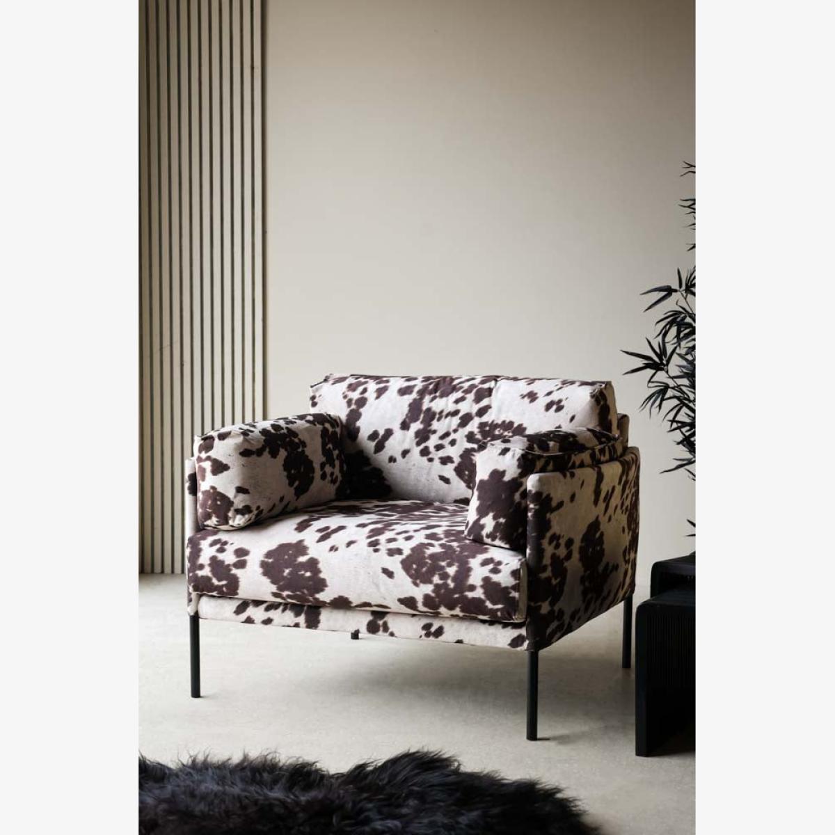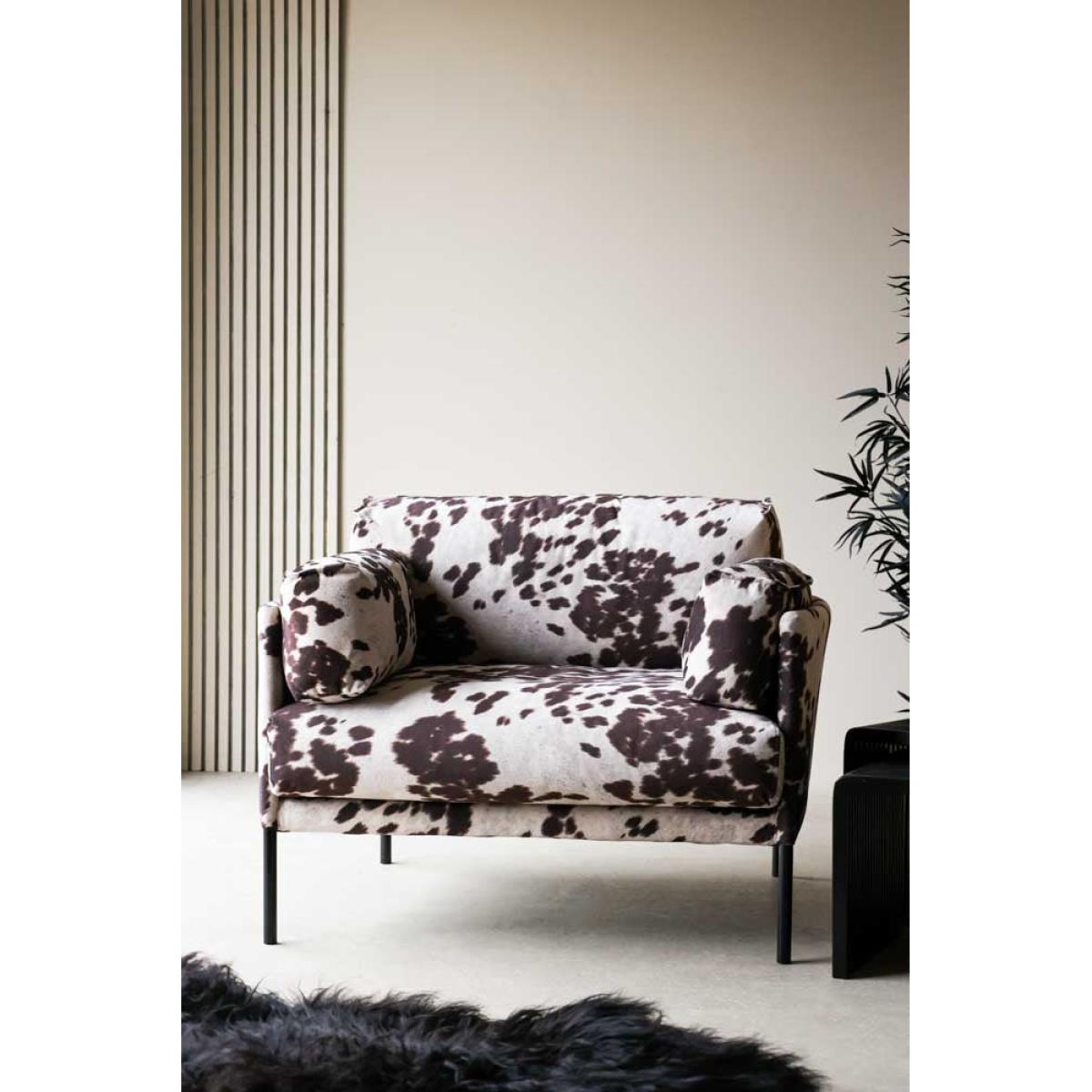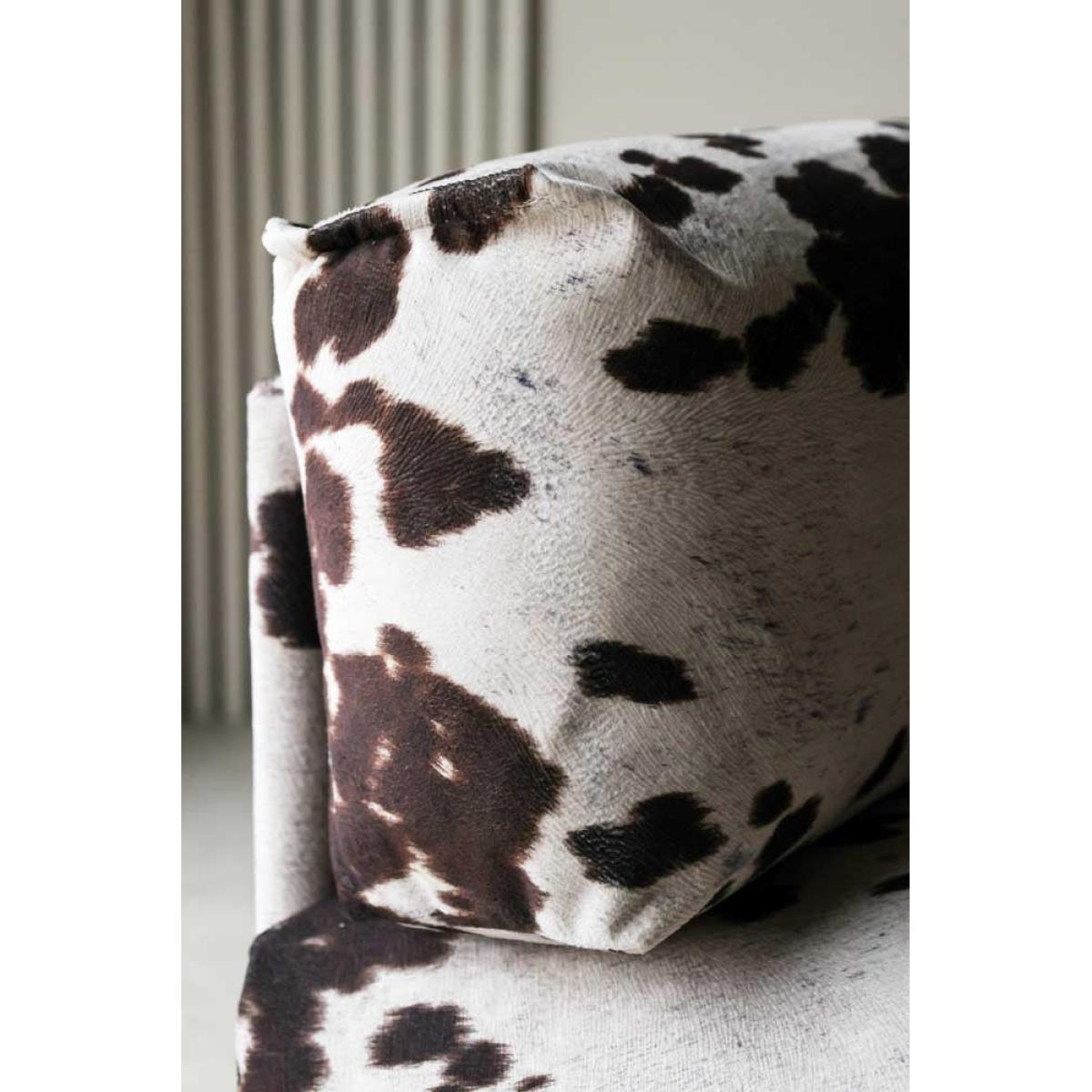 Cosy up in style with the Cowhide Patterned Armchair. Inspired by Western cowboy culture, this fabulous occasional chair reinvents vintage Americana for the modern home. A hero velvet armchair for your living room or bedroom, the clever upholstery fabric creates an incredibly realistic take on natural cowhide. Perfect for embracing saloon style without introducing an animal product to your home, the luxe lounge chair is guaranteed to become the centre of attention in any space. With a low-pile velvet that is soft and cosy, the cowhide pattern occasional chair provides a sumptuous spot for rest and relaxation after a long day. Whether styled in the corner of your bedroom or introduced to your living room as the wow factor feature, this chair is the main event for both maximalist and minimalist spaces. - Brown and white cowhide pattern velvet armchair - Measures:H82cm x W107cm x D94cm - Made from polyester velvet