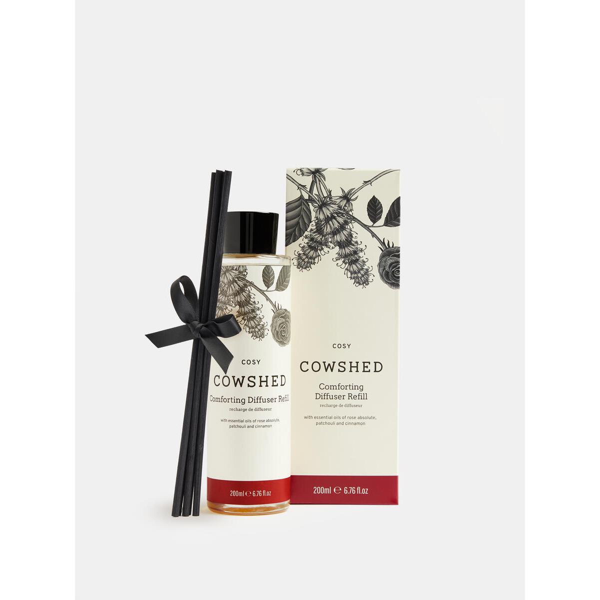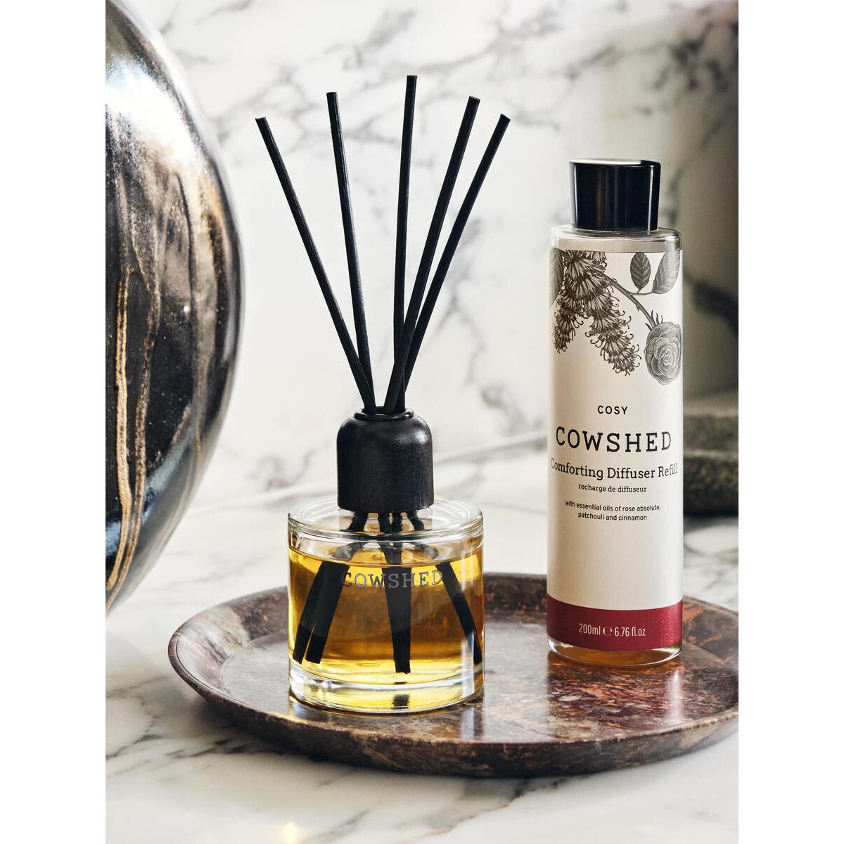 Our Cosy diffuser refill has a spicy floral blend of Rose Absolute and Patchouli to make your home feel like a sanctuary. Ourcommitment to natural products means that the fragrance is madewith wildcrafted essential oils and organic botanicals. Free fromartificial preservatives, the colour of our diffusers can vary andmay appear darker than others on the market. Rose Absolute and Patchouli essential oils. Fills your current diffuser twice over. Made in England. Used in every Cowshed spa.