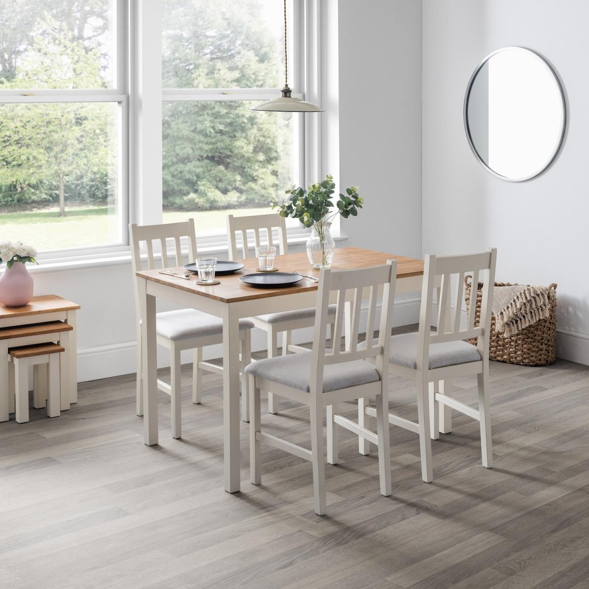The Coxmoor set is a versatile choice for both modern and traditional dining spaces, thanks to its clean white finish paired with warm oak accents. It works particularly well in interiors aiming for a fresh, light, and airy feel, making small rooms seem more spacious. Styling tips include pairing it with neutral or pastel-hued accessories for a soft look, or contrasting it with bold coloured tableware and textiles to create a vibrant, contemporary vibe. To maintain its appearance, consider using placemats and coasters to protect the surface, while adding a statement centrepiece-such as a lush green plant or a modern candle arrangement-to bring personality and warmth to your dining area.