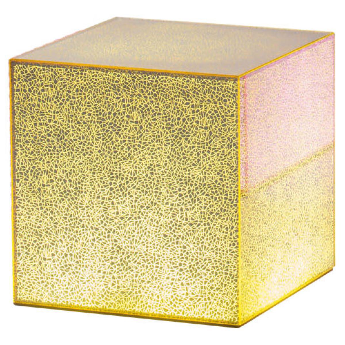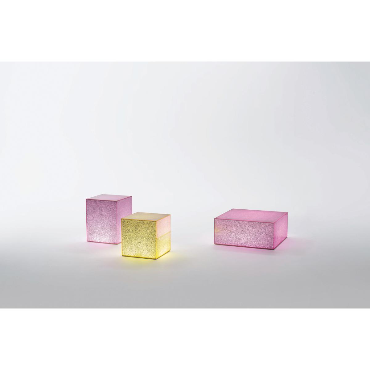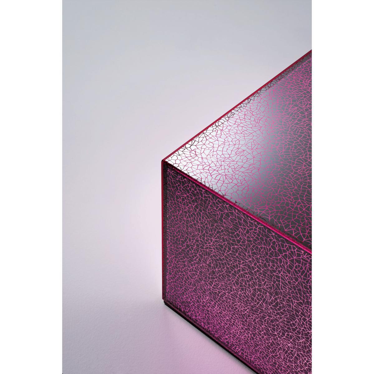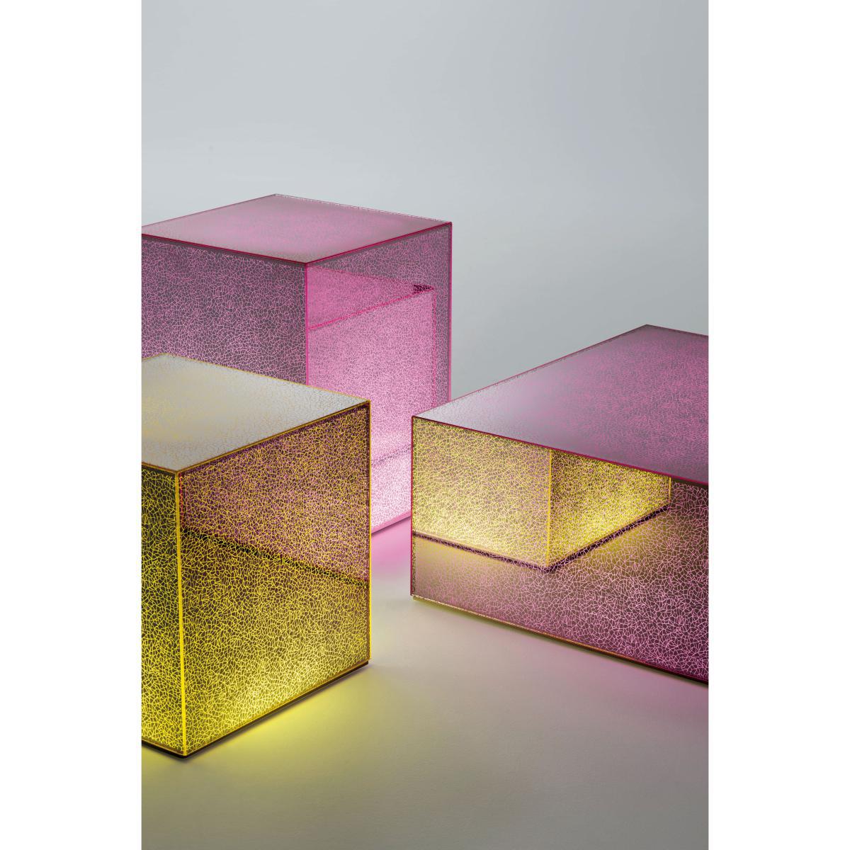 Crack by Glas Italia is a collection of low tables with dimmer light or without light with parallelepiped shape, in glass glued at 45°, with shattered mirror effect decoration separated by thin coloured lines, available in glossy coloured diffusor glasses. In the lit version the light seeps through the glass gaining colour and diffusing it all around.