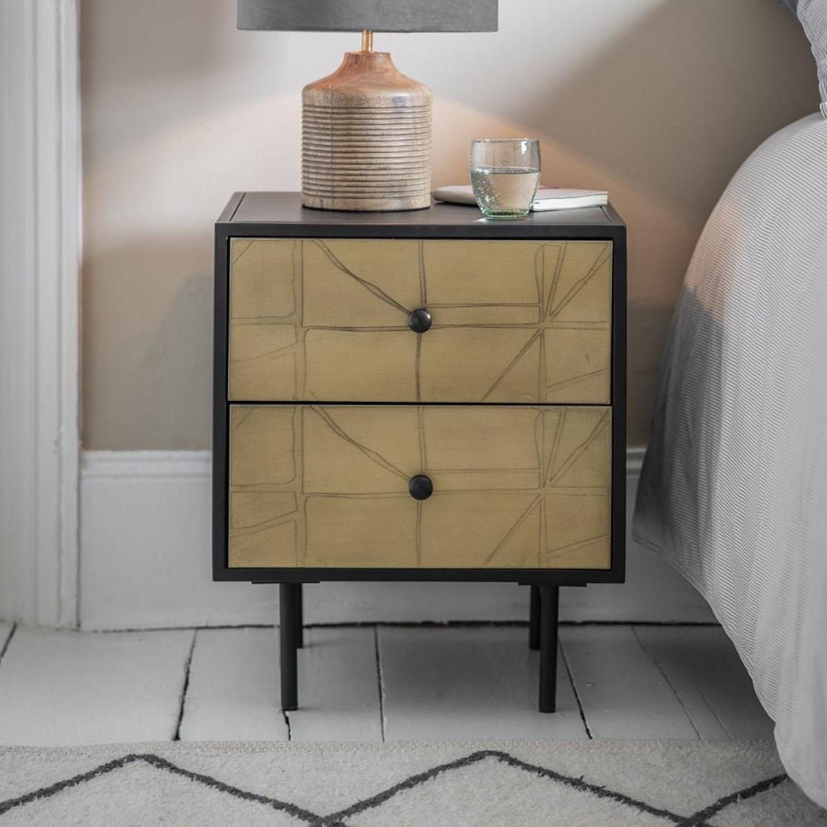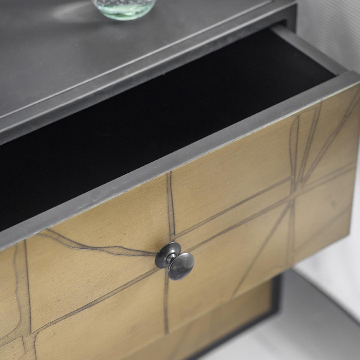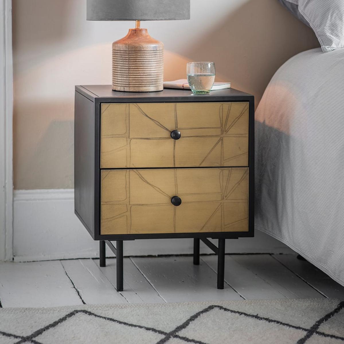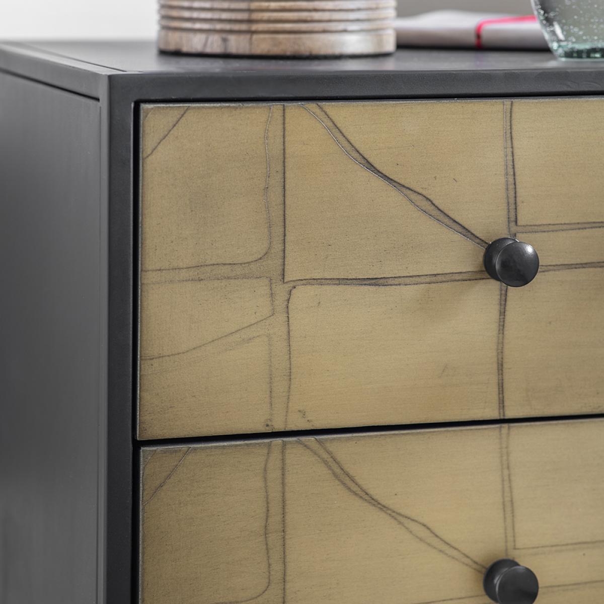 Ideal for classic or contemporary living areas, dining rooms and open-plan spaces, our Crackle Bedside Table features a soft antique brass colour carcass with a distinctive acid etched crackle effect. The 2 drawer bedside table has plenty of storage space in its two generous drawers, with space for all your night time essentials. The mix of brass tabletop with black stiletto style legs creates an elegant look that works well in glamorous contemporary living areas and also sits well alongside more traditional interiors for an eclectic mix. Our Crackle range also comes in a matching coffee table and sideboard for a co-ordinated finish to your home.