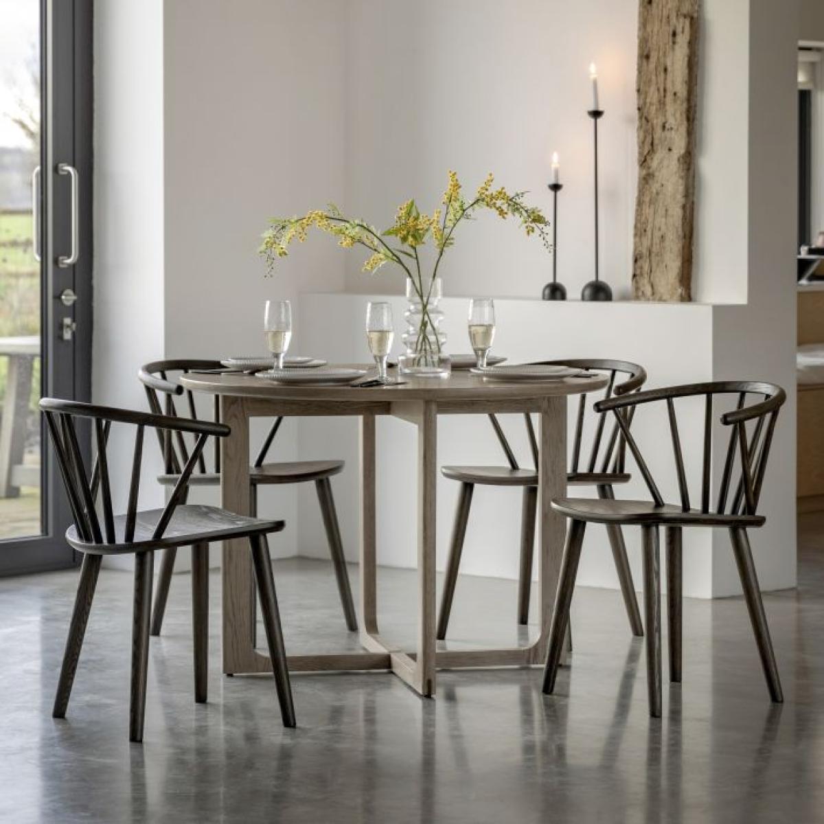 Crafted from the finest oak and structural oak veneers where practical, this stunning dining table pairs perfectly with the matching chairs. The table offers elegant design, with its simple round top and beautifully shaped underframe. The wood has a smoked oak finish. The table is also available in a natural finish, and matching pieces are available.