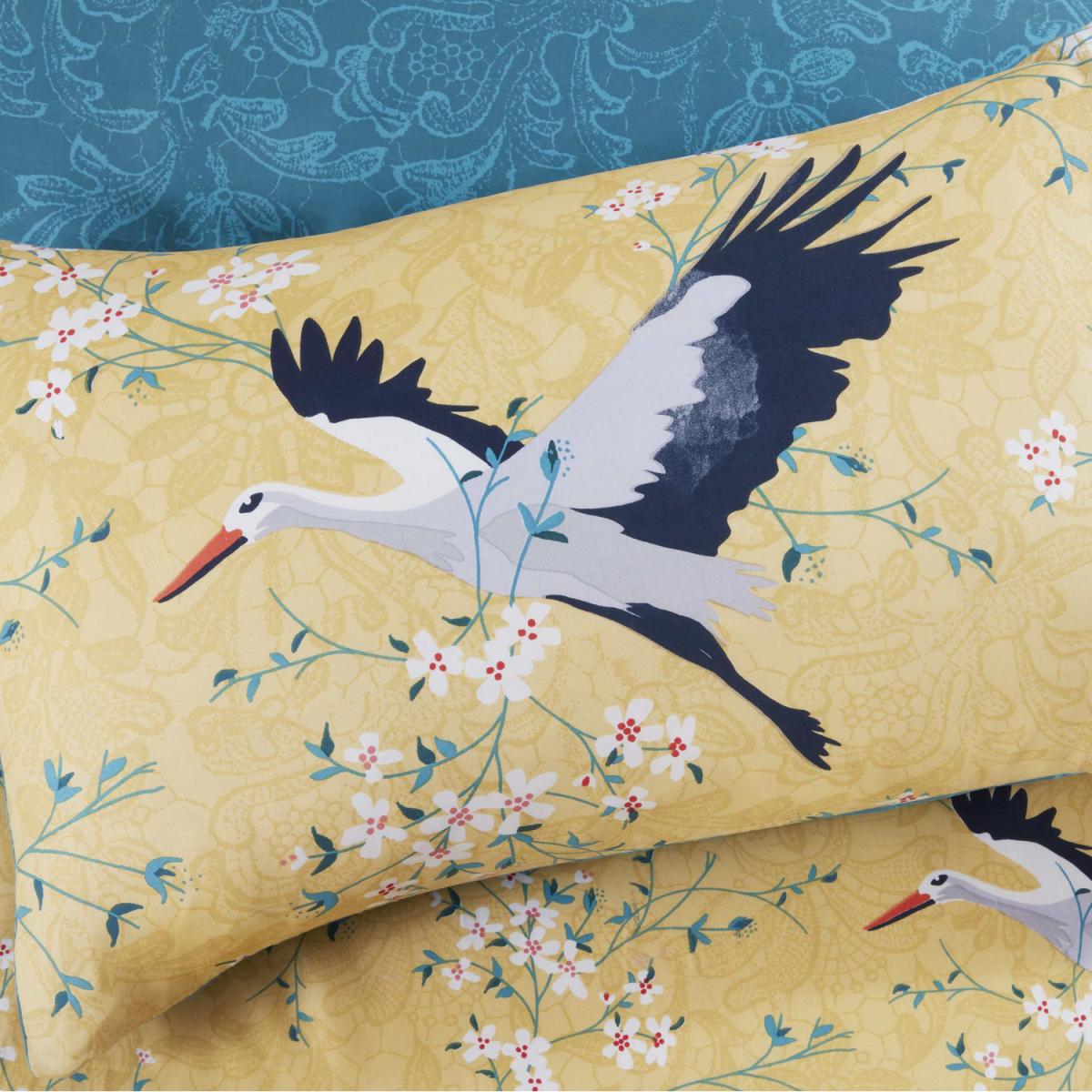 Our new and exclusive Cranes design will add a splash of colour and quirkiness to any bedroom. Featuring elegant cranes in flight on an ochre backdrop. Fully reversible with a printed lace pattern reverse in teal. Perfect for a good night's sleep our So Soft printed bedding range is cosy and gentle against your skin. Made with 180 thread count microfibre making it non-iron, durable and machine washable.