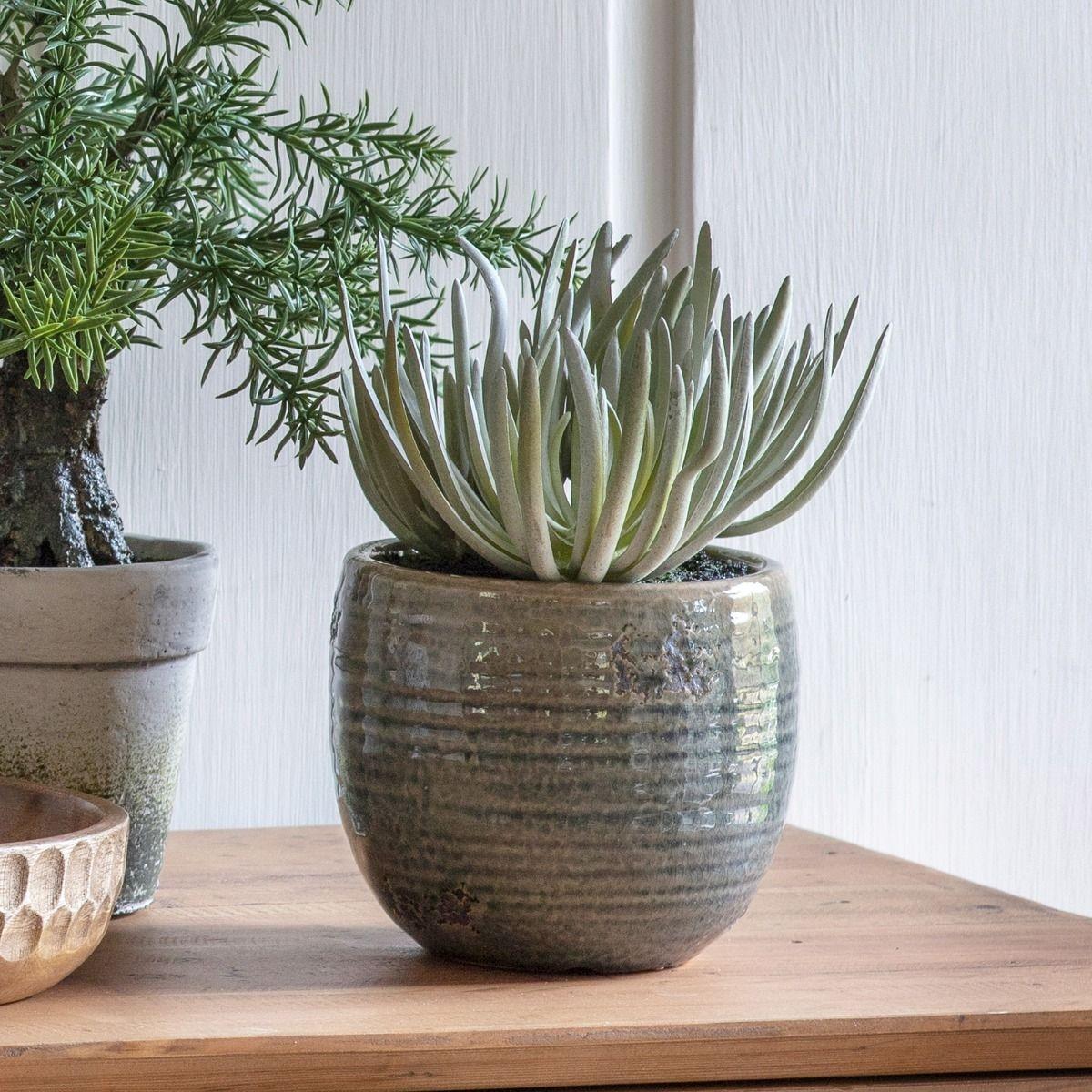 Trendy faux plant in a pot. Add a botanical touch to your home with the Crassula faux plant. Featuring a realistic faux plant in a stylish iridescent grey pot. This plant will be the perfect finishing touch to lounges, bedrooms and hallways.