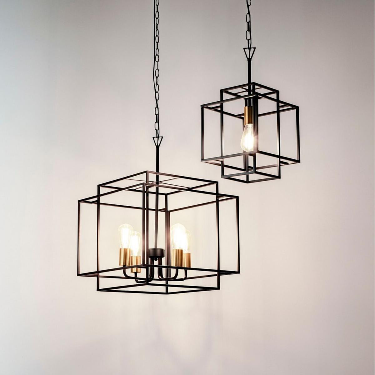 The Crate frame pendant with adjustable height cable, offers an on-trend style for a modern living space. The single metal light design is made in a matt black finish with gold detail on the lamp holder. Perfect as a single light or in multiples for living areas or breakfast bars.