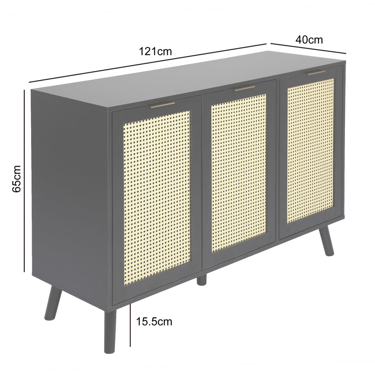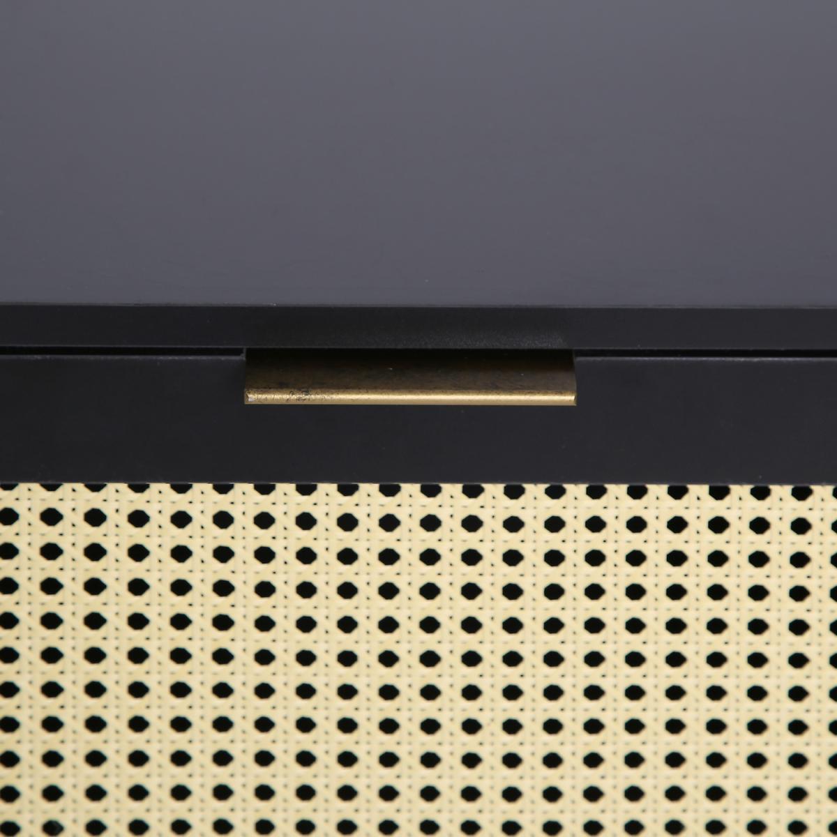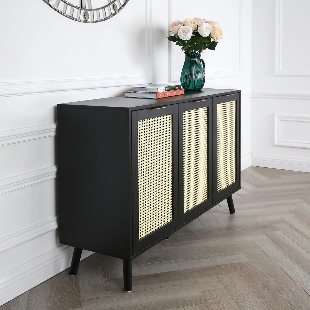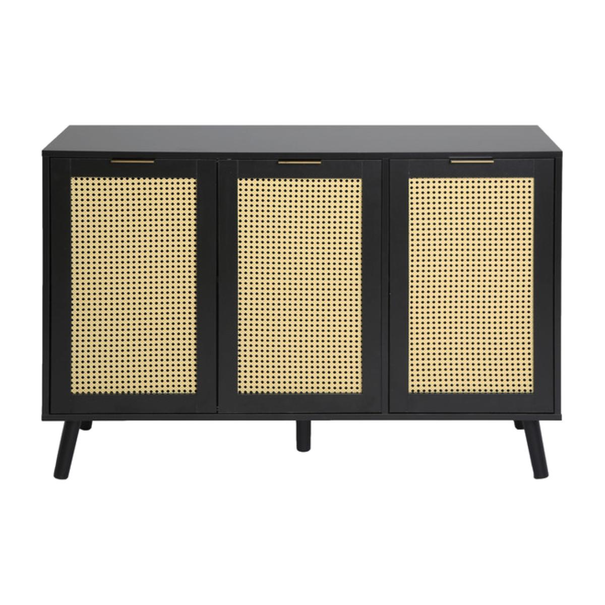 The Craven sideboard offers you plenty of storage without compromising on style. With natural cane doors and a contrasting black painted finish, this sideboard will look great in any living space. Craven is a 3-door sideboard with natural cane doors and a black painted finish. The Craven works well in living rooms and dining rooms, providing storage for items such as dining crockery or spare blankets. It features three internal shelves for storing board games or storing spare blankets, making it a versatile piece of furniture. This 3-door cabinet has an innovative space-saving design with enough room to contain as many items as possible. It is a convenient and beautifully crafted furniture that can help declutter your indoor space. This cane cabinet is particularly sturdy in nature, with three doors that allow you to maximise its use. It is a piece of multi-purpose furniture that can serve several indoor or domestic uses. With its solid construction and weight-bearing capacity, it is able to contain high loads. Additionally, the three doors come fitted with quality wear-resistant hinges that facilitate the opening and closing of the cabinet.