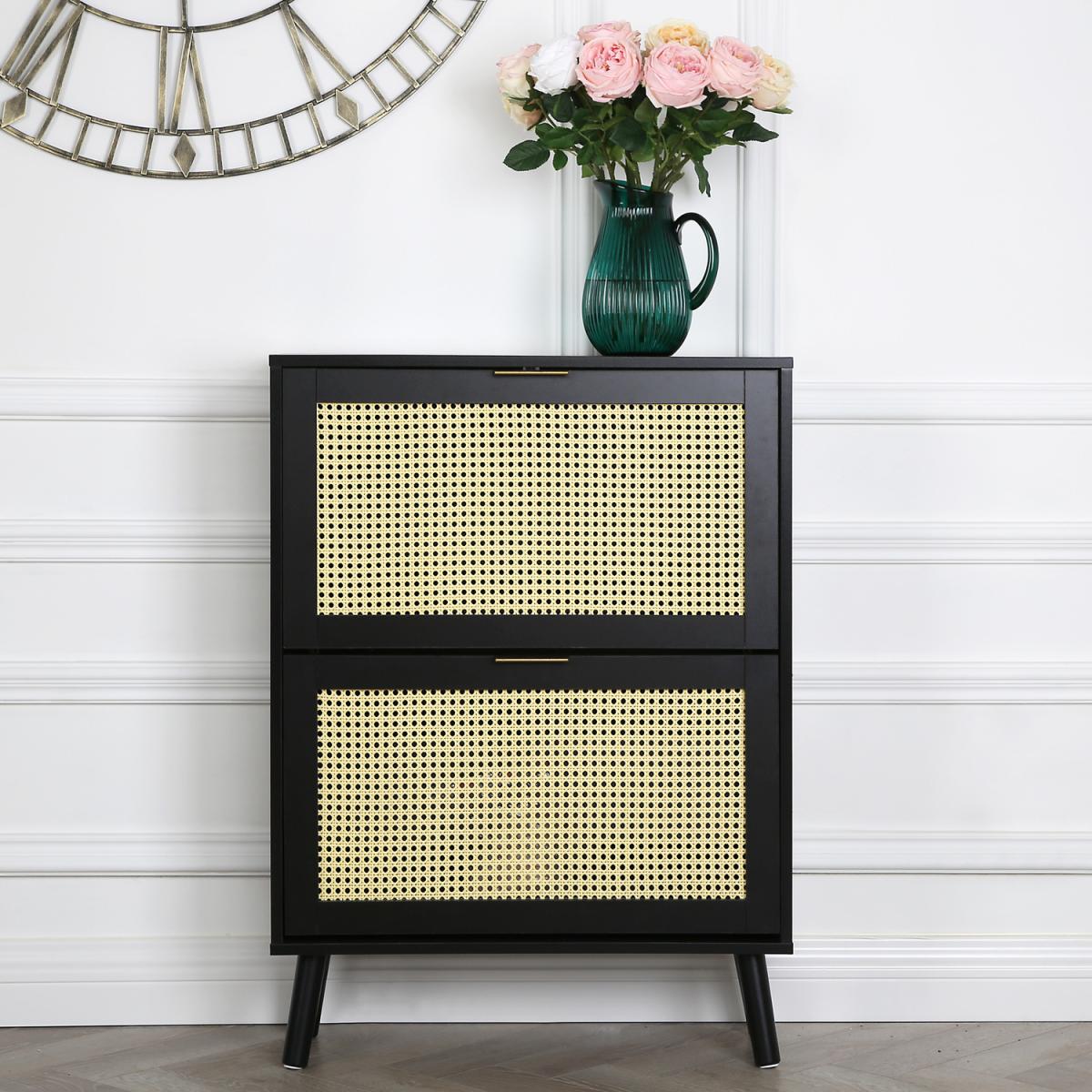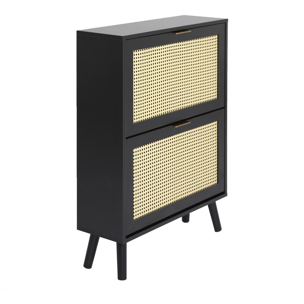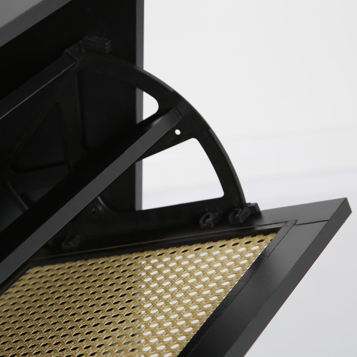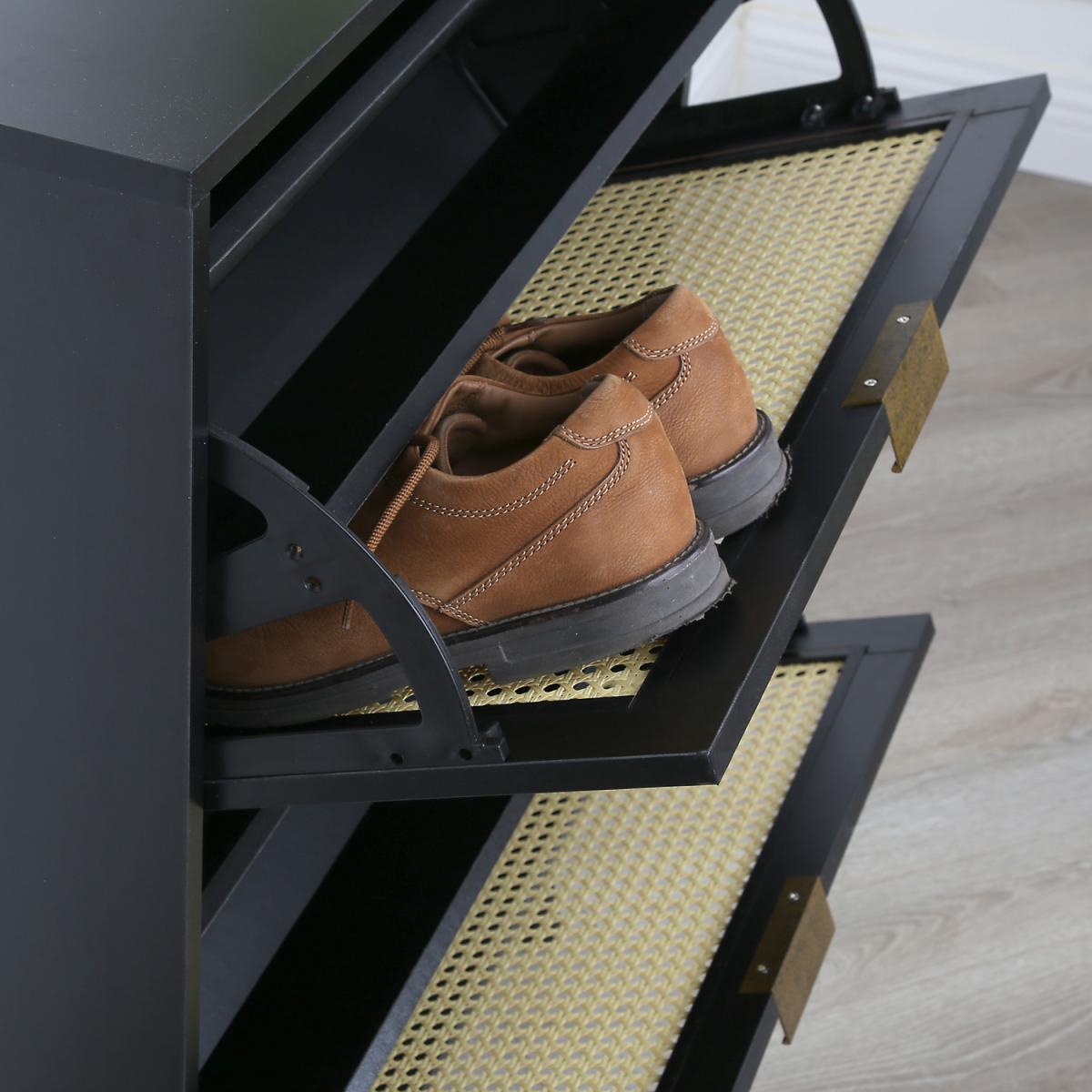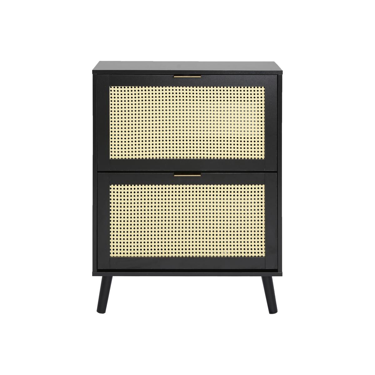 The Craven Shoe cabinet makes a stylish addition to any room. It's ideal for compact spaces. The Craven's cane shoe cabinet provides a superb space-saving option for smaller living areas. The two spacious drawers provide ample space for all your footwear. This cane shoe cabinet features a rustic charm of wooden elegance that adds a superior touch of luxury and style to your interiors. It can contain as many shoes as possible lined horizontally on the shelves. The PE cane doors help prevent the shoes from gathering dust while allowing for good airflow and improving its aesthetic looks. Its clear dark brown colour texture makes it an ideal modern addition to your home. It features four sturdy retro rubber wood legs that lift it a few inches off the ground. This cane shoe cabinet is particularly scratch-resistant thanks to its MDF melamine panels.