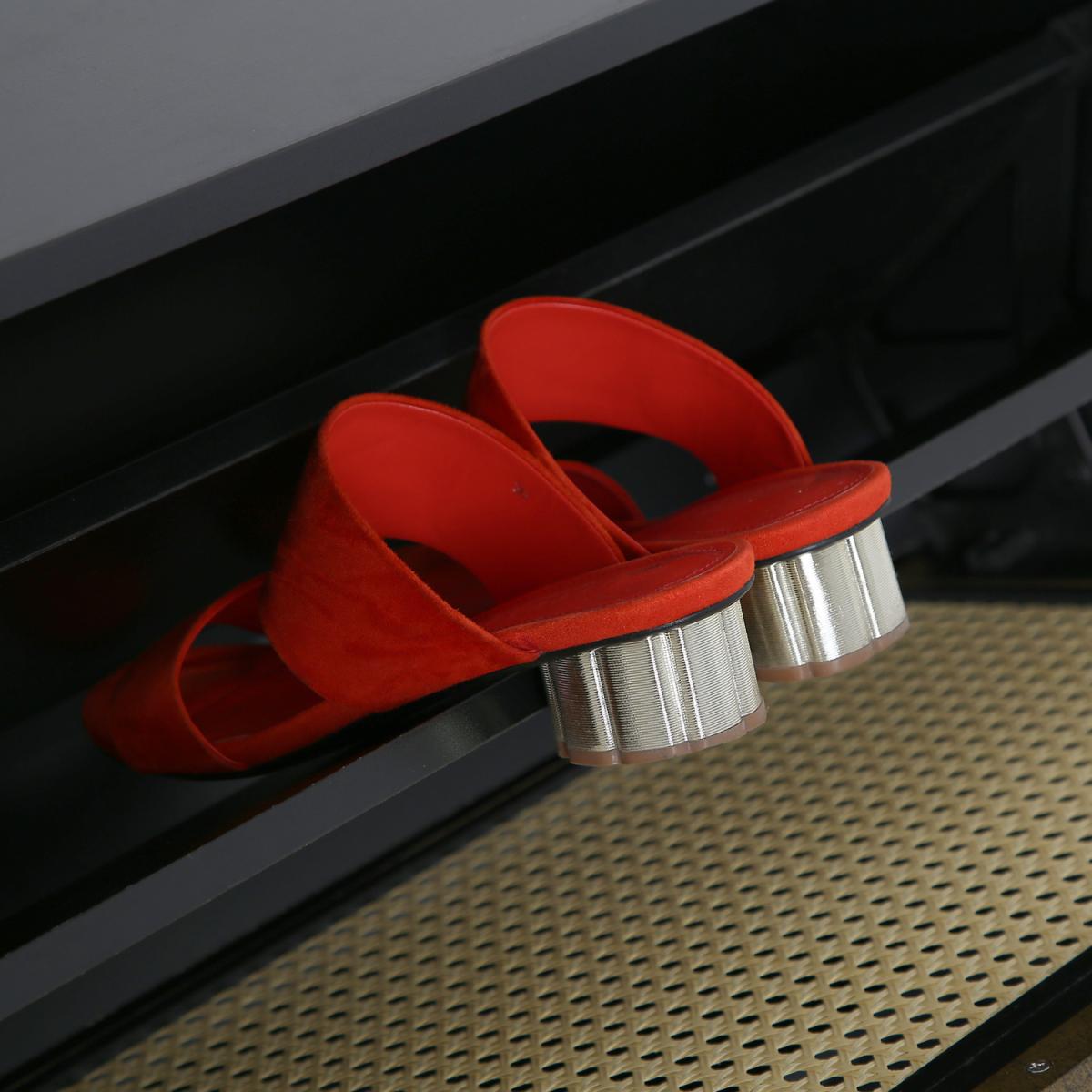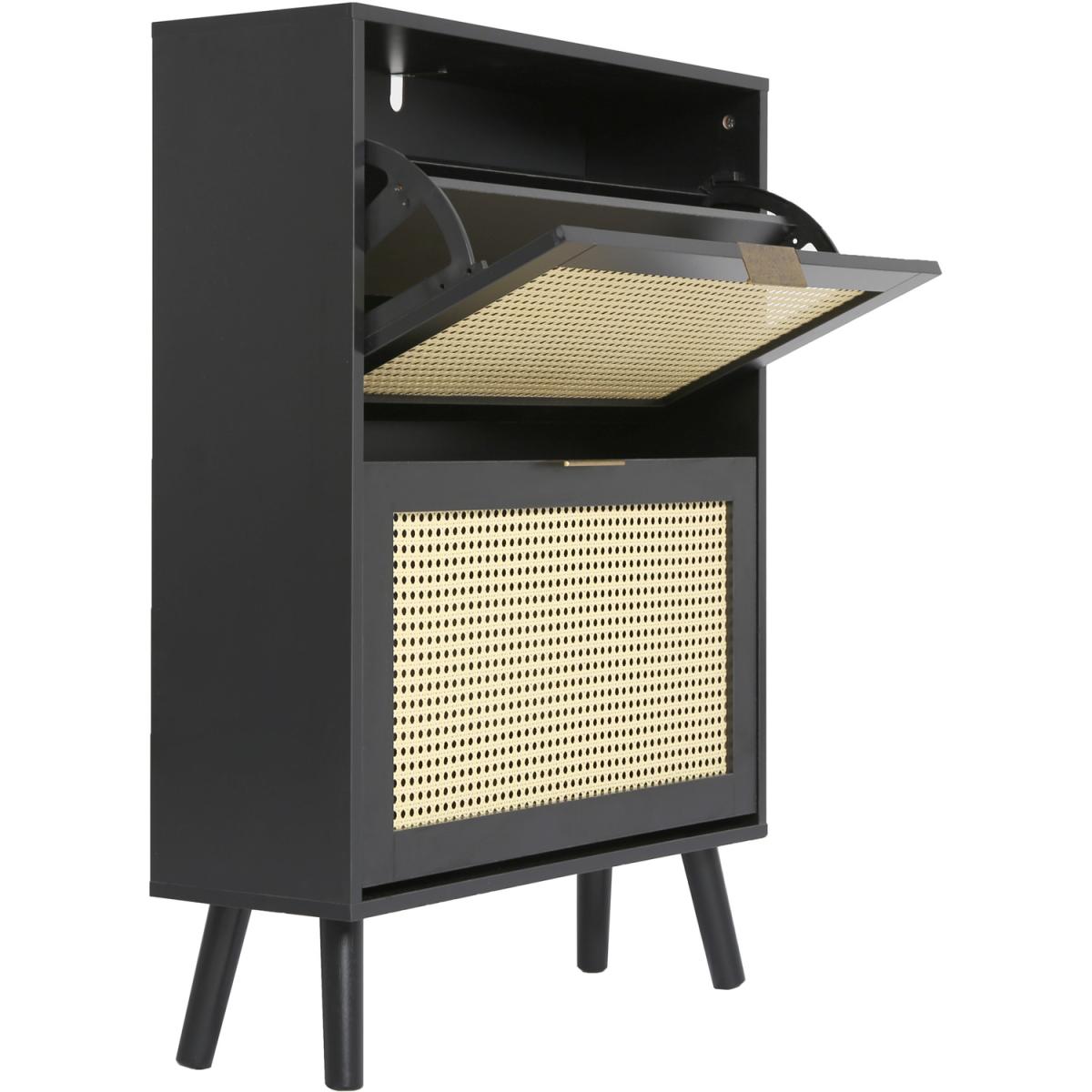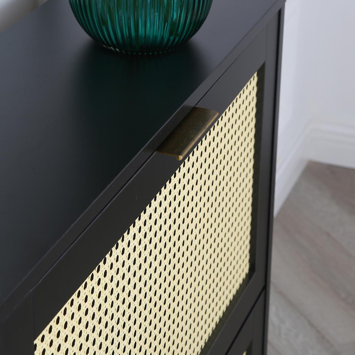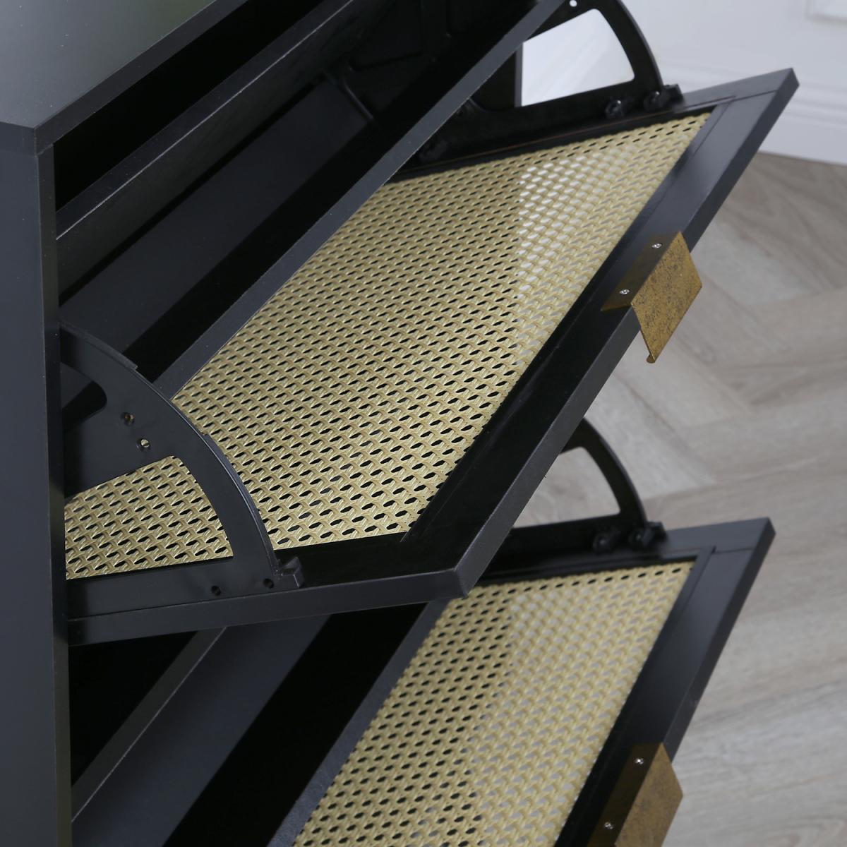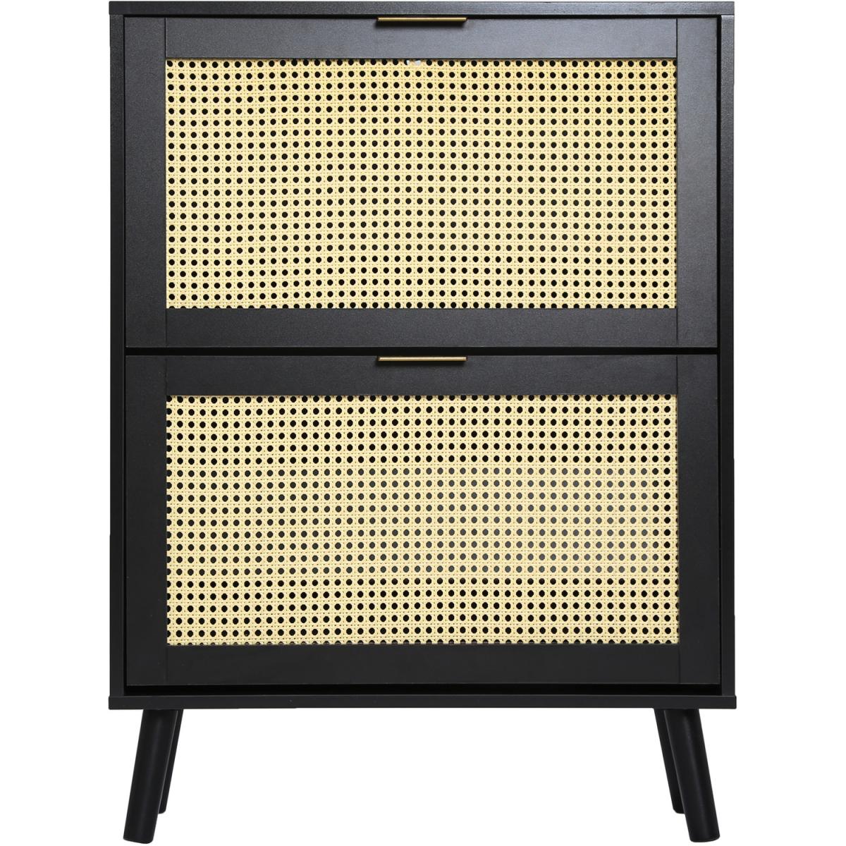 The Craven Shoe cabinet makes a stylish addition to any room. It's ideal for compact spaces. The Craven's cane shoe cabinet provides a superb space-saving option for smaller living areas. The two spacious drawers provide ample space for all your footwear. This cane shoe cabinet features a rustic charm of wooden elegance that adds a superior touch of luxury and style to your interiors. It can contain as many shoes as possible lined horizontally on the shelves. The PE cane doors help prevent the shoes from gathering dust while allowing for good airflow and improving its aesthetic looks. Its clear dark brown colour texture makes it an ideal modern addition to your home. It features four sturdy retro rubber wood legs that lift it a few inches off the ground. This cane shoe cabinet is particularly scratch-resistant thanks to its MDF melamine panels.