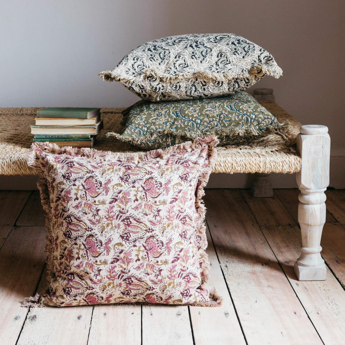 An arts and crafts inspired floral cushion in cream and dark rose hues framed by a tufted textural fringing.