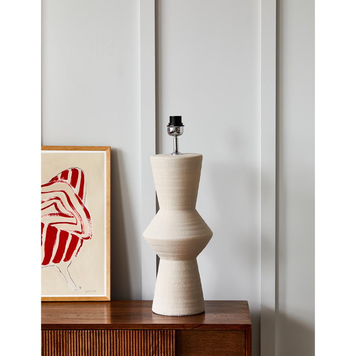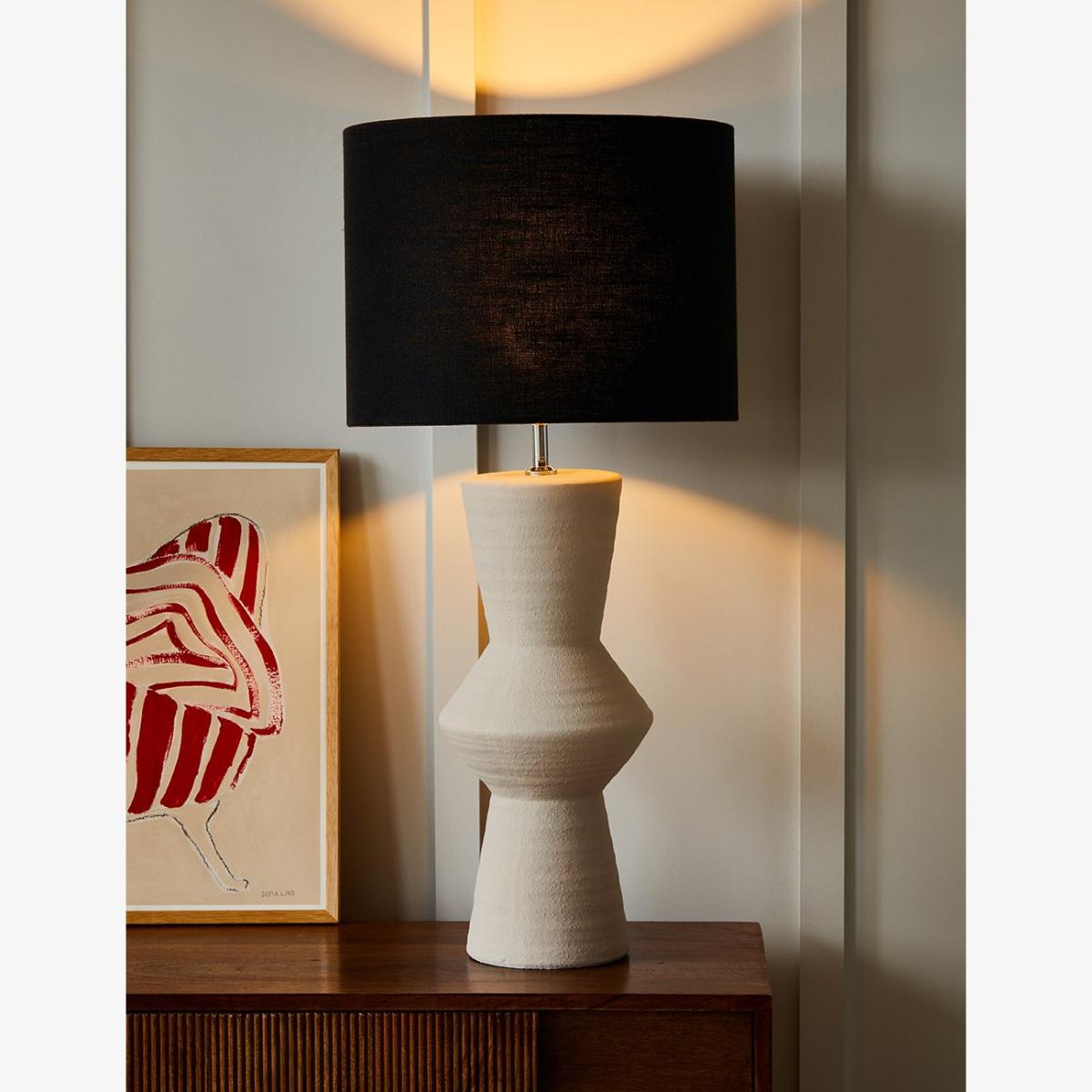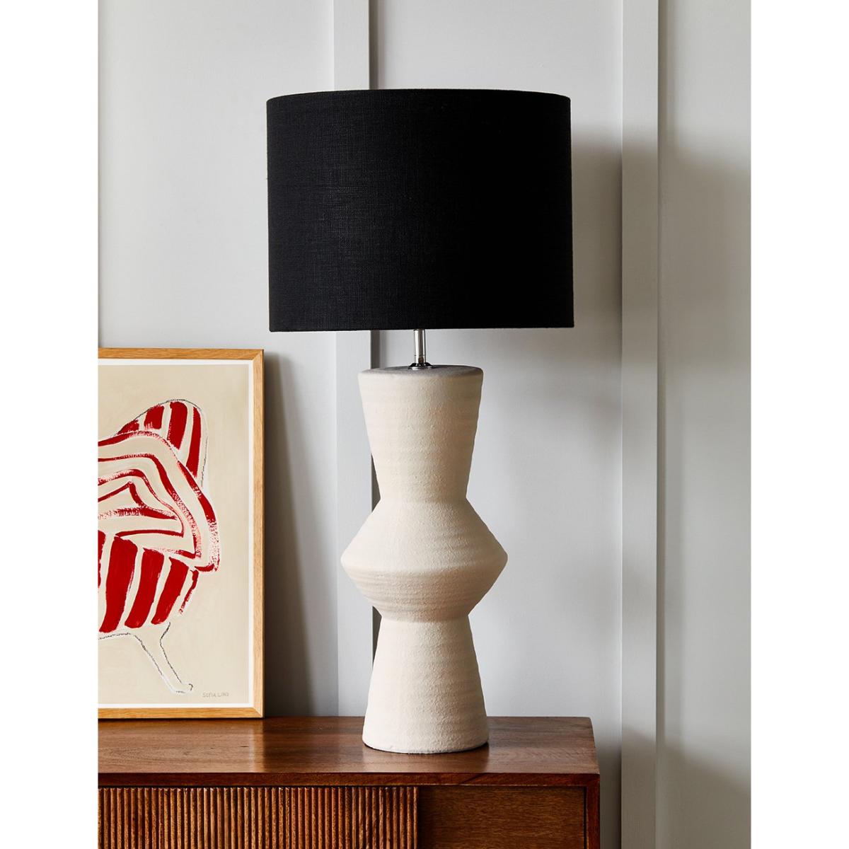 Our Cream Ayla Ceramic Table Lamp with a Black Linen Shade is a monochrome lover's dream! The beautiful cream ceramic base is paired perfectly with the black linen lampshade, creating a harmonious and stylish look. The unique and abstract shape of the lamp is sure to add character and charm to your room. Standing at 79cm tall, the Ayla Ceramic Table Lamp can be used as a desk lamp, bedside table lamp, or to light up any corner of your home. Paired here with our Large Black Linen Shade or create your own look with our selection of lamp shades. Also available with a black base and white shade
